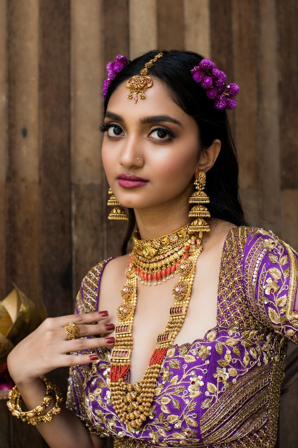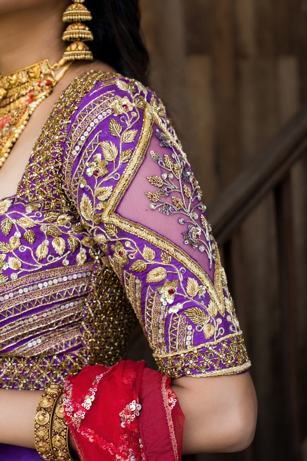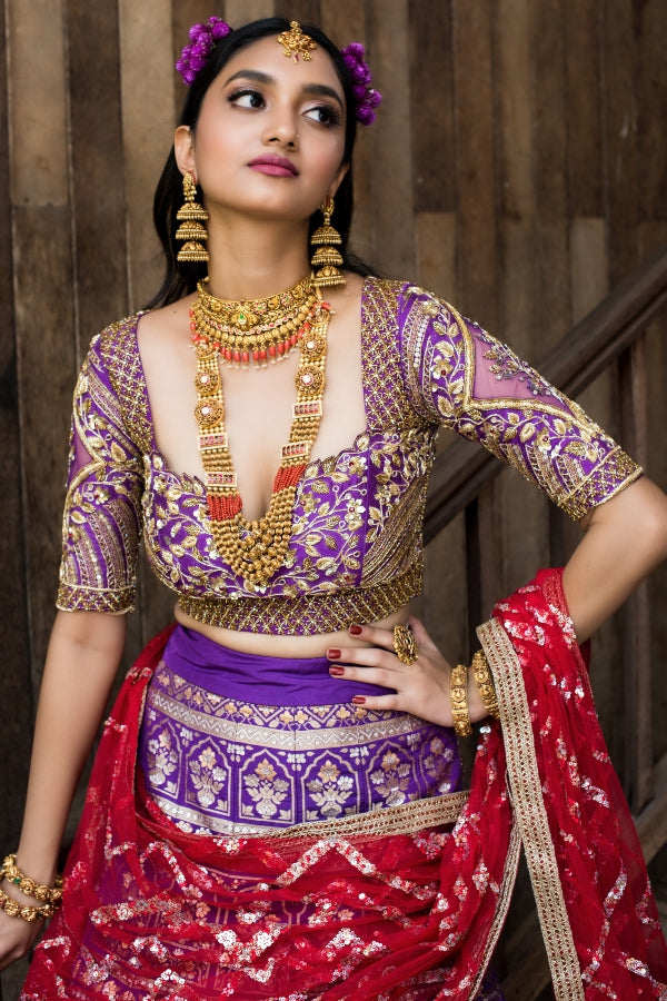 A strikingly elegant Embroidered Banares Silk Lehenga in Purple paired with a hand embroidered designer blouse is a perfect Reception Outfit