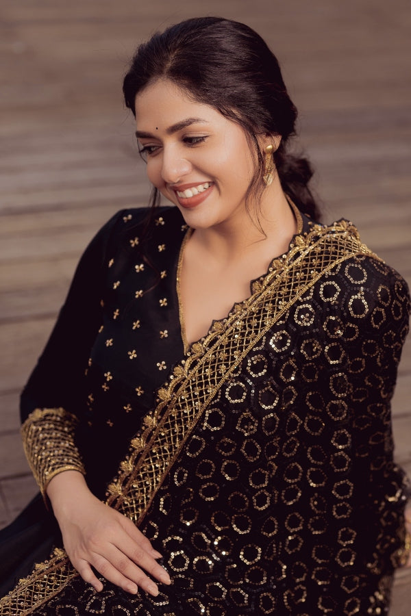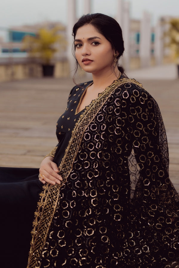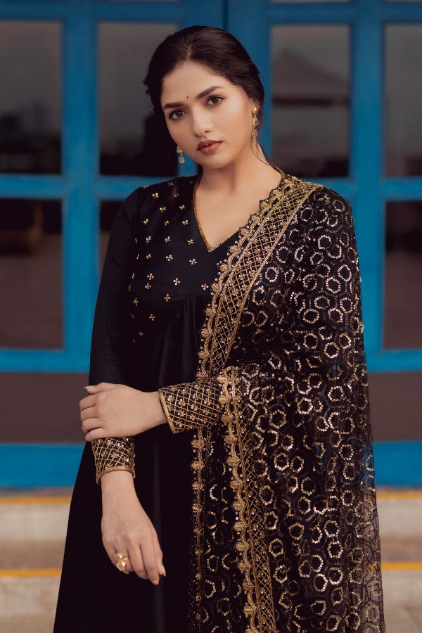 A studio149 contemporary classic, this black Designer anarkali in crepe silk paired with a hand Embroidered Dupatta is a perfect bridal wear.