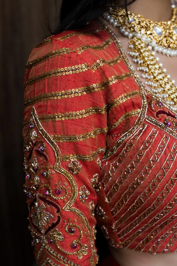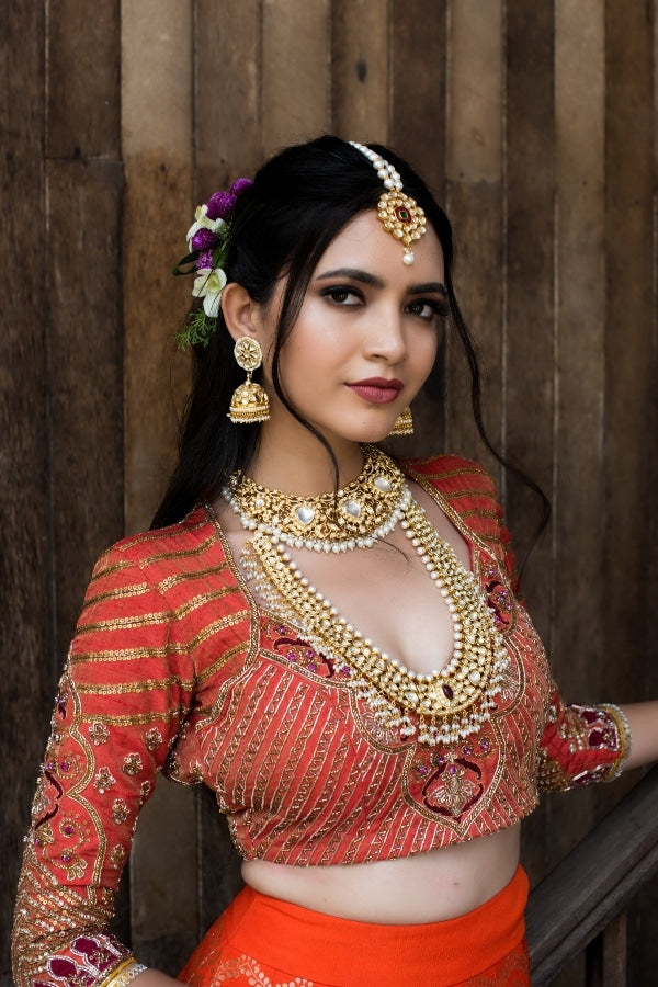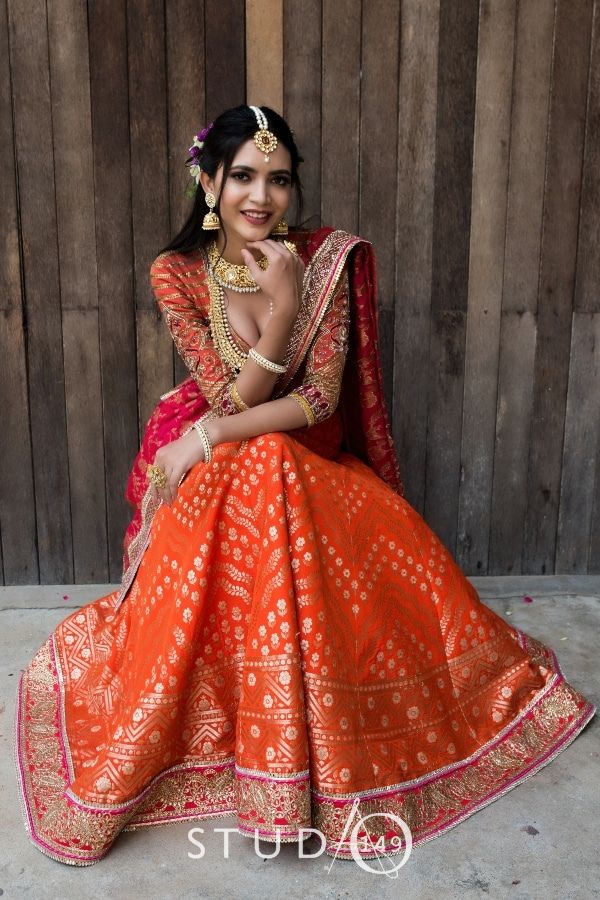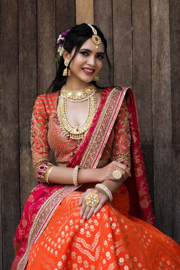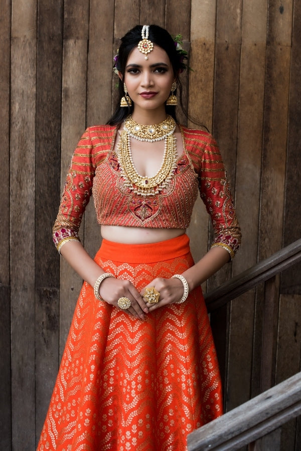 Richly adorned with hand embroidered designer Banares silk lehenga in orange paired with our signature designer blouse, this is a perfect wedding lehenga