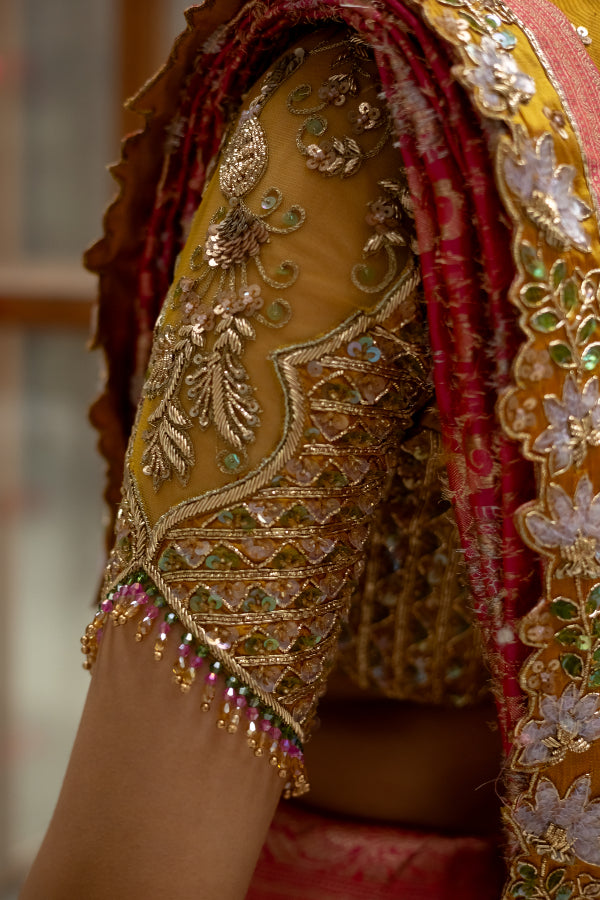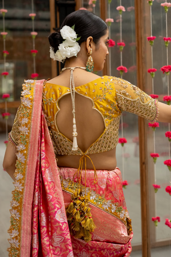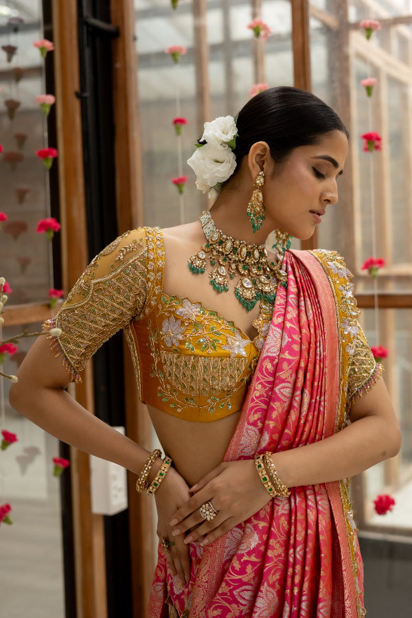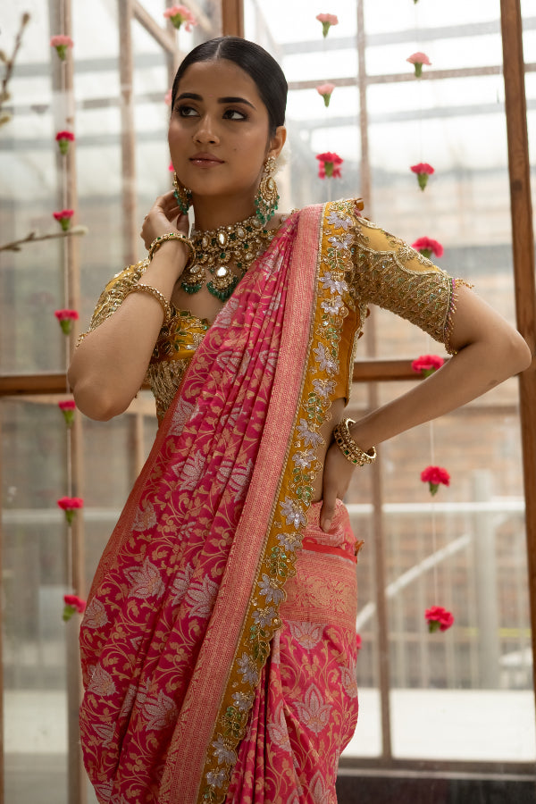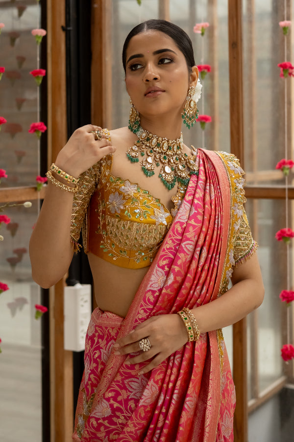 Featuring a banares saree in dual shades of pink and orange with hand embroidered borders. The saree is paired with a vibrant yellow silk blouse with tulle sleeves and an elegant sculpted neckline.
