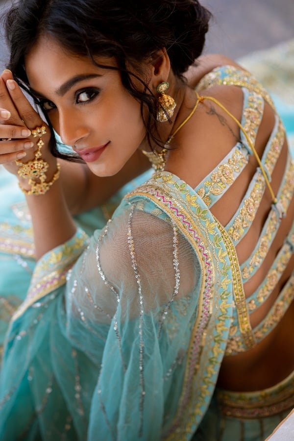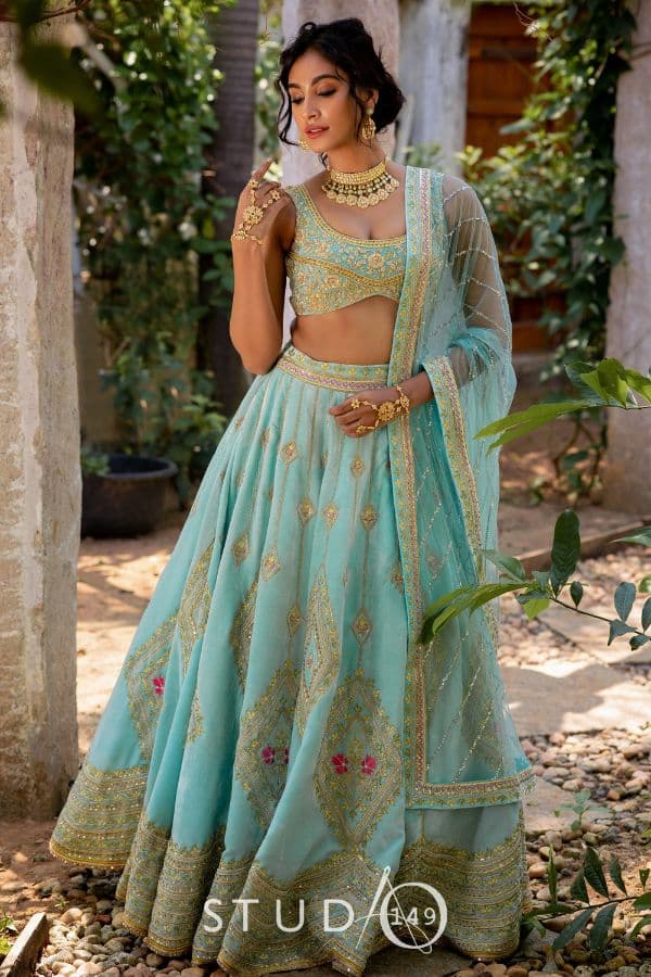 Enhancing an all pastel blue designer silk velvet Lehenga paired with our designer blouse, a right mix of tradition and modernity