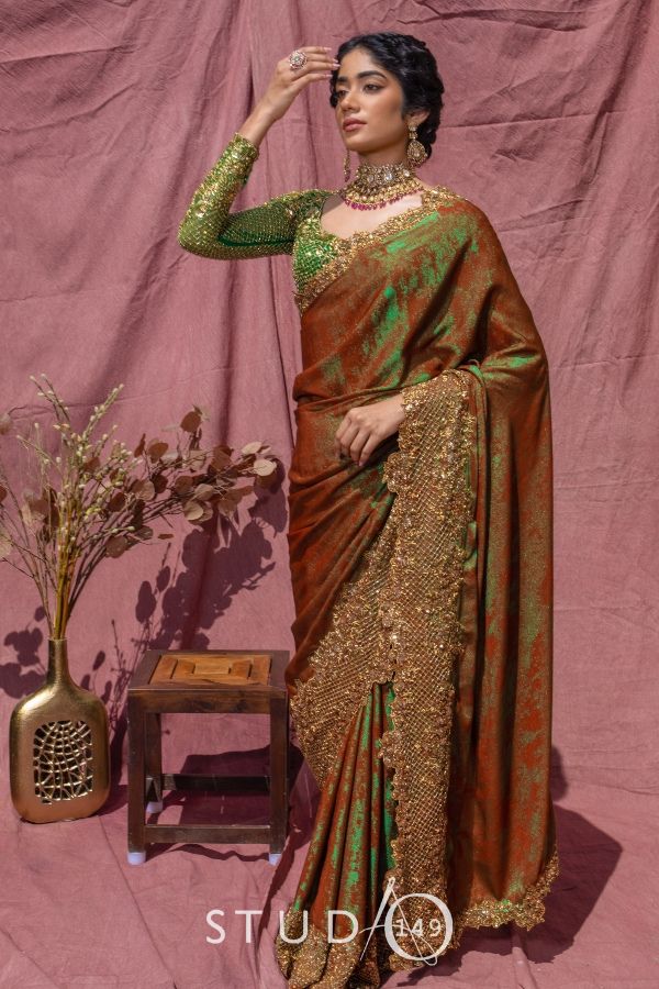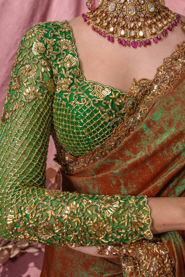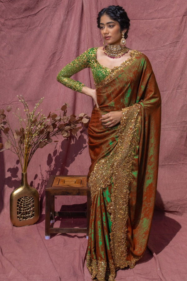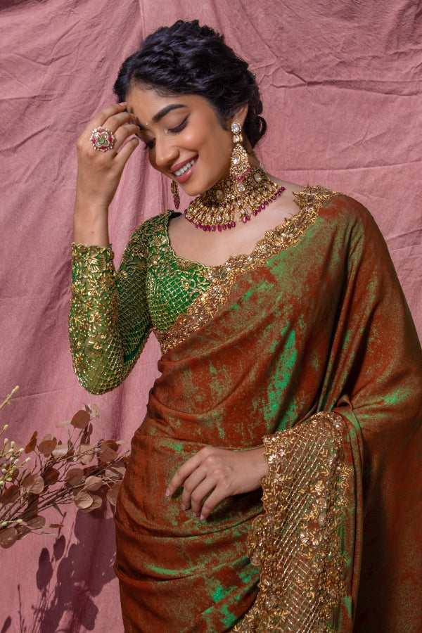 The harmony of exquisite craftsmanship that drapes along with the fine tones of green and brown, effortlessly paired with a green hand embellished blouse.