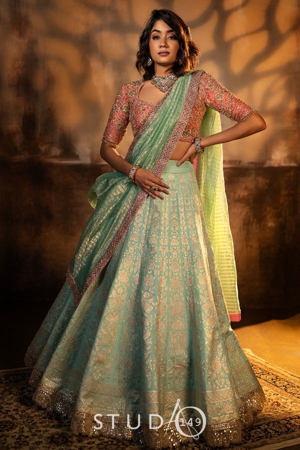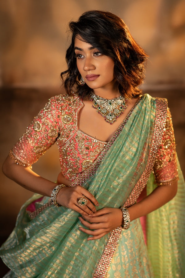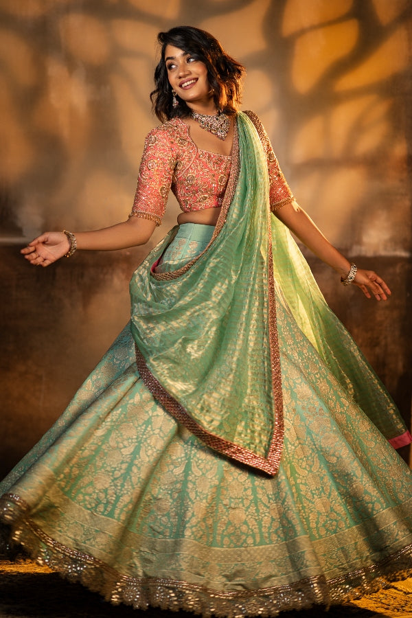 An ethereal allure of mint green Banarasi lehanga paired with hand embroidered peach blouse along with a banaras organza dupatta matching the hues of the skirt completing this dreamy ensemble.