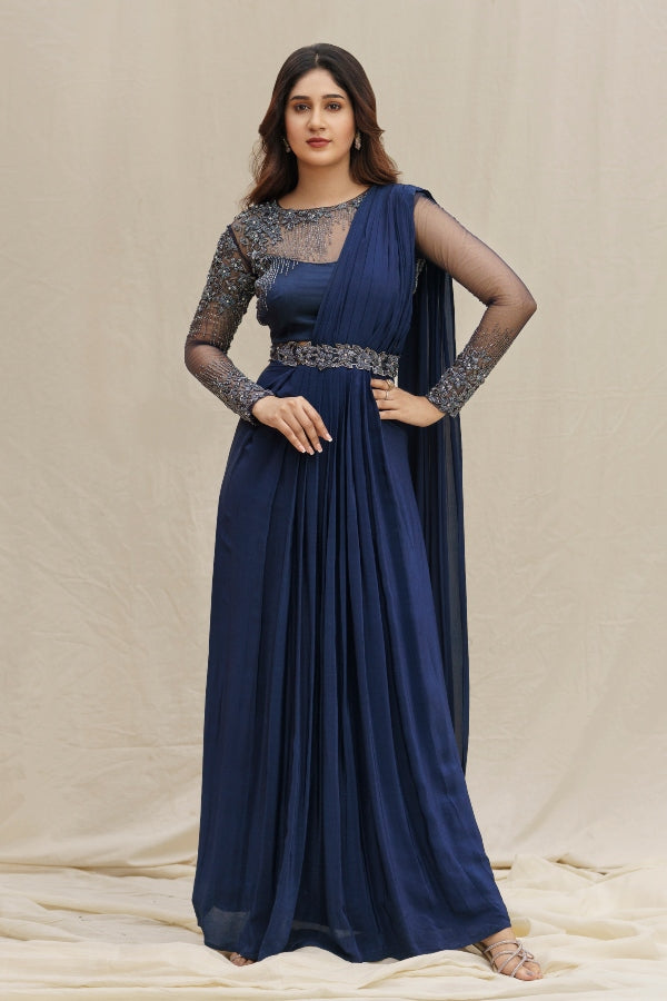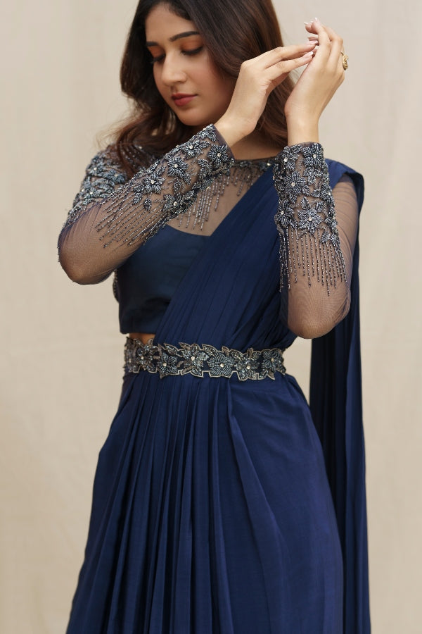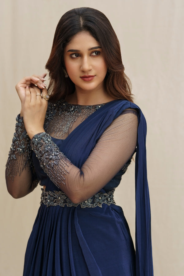 An exclusive Bridal Designer Draped Saree Set in navy blue paired with a stunning tulle blouse is a perfect cocktail and reception outfit.