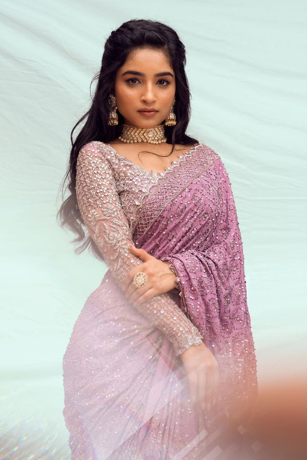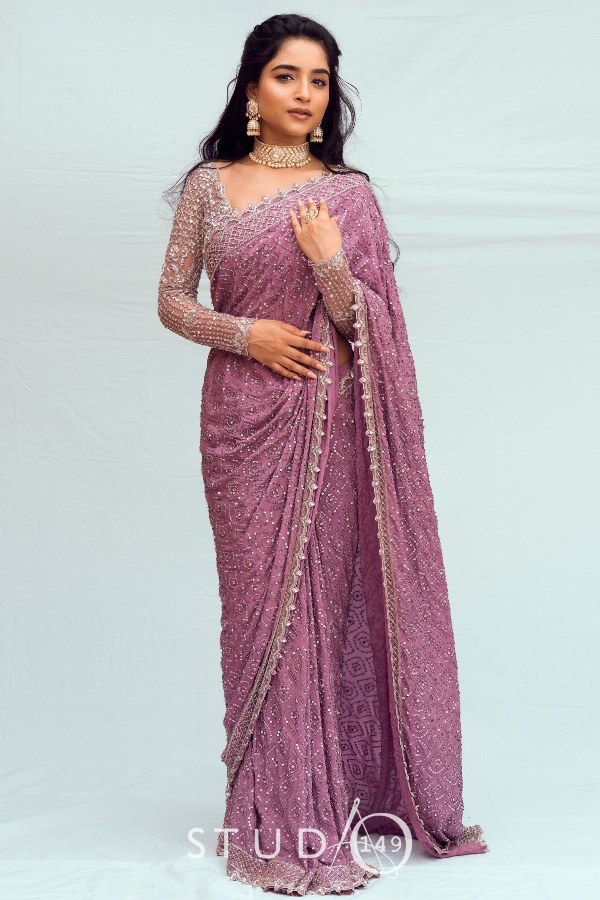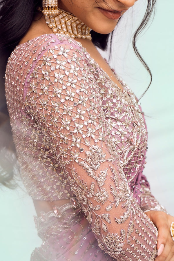 Easily one of Studio149’s most favourite Reception saree – a wedding designer mauve saree set paired with a designer blouse