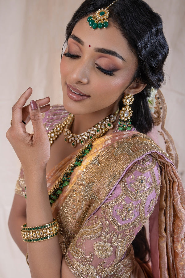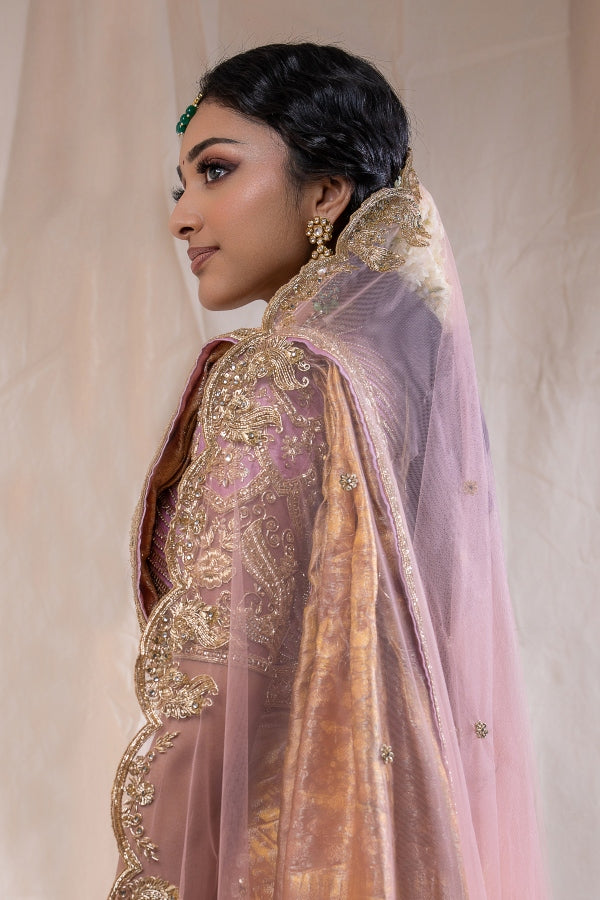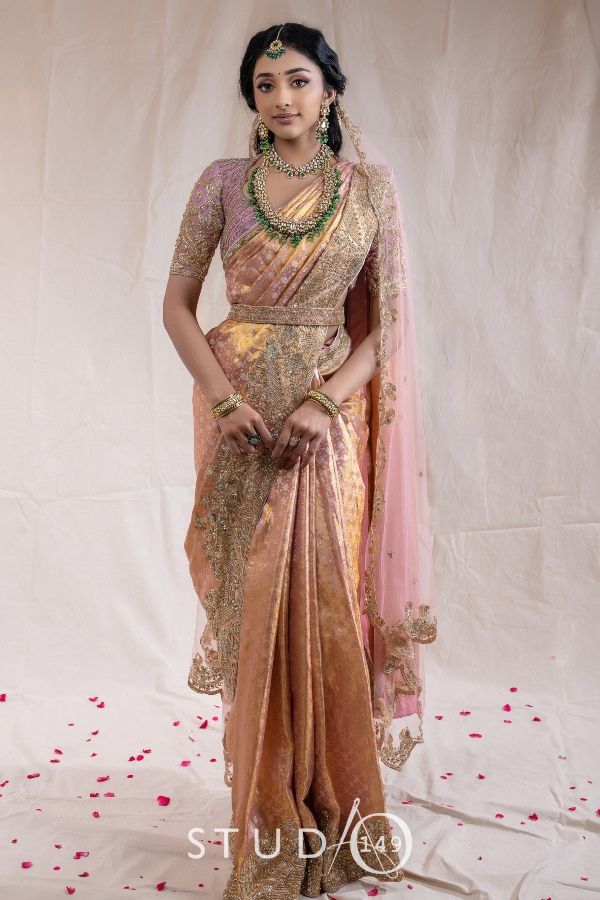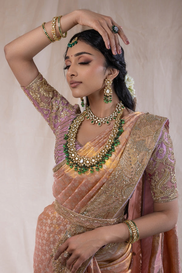 Elevate your elegance with this tissue Kanjeevaram saree in peach. Handcrafted with utmost precision and care, this saree seamlessly feels like royalty when paired with the stunning patchwork blouse in lilac.
