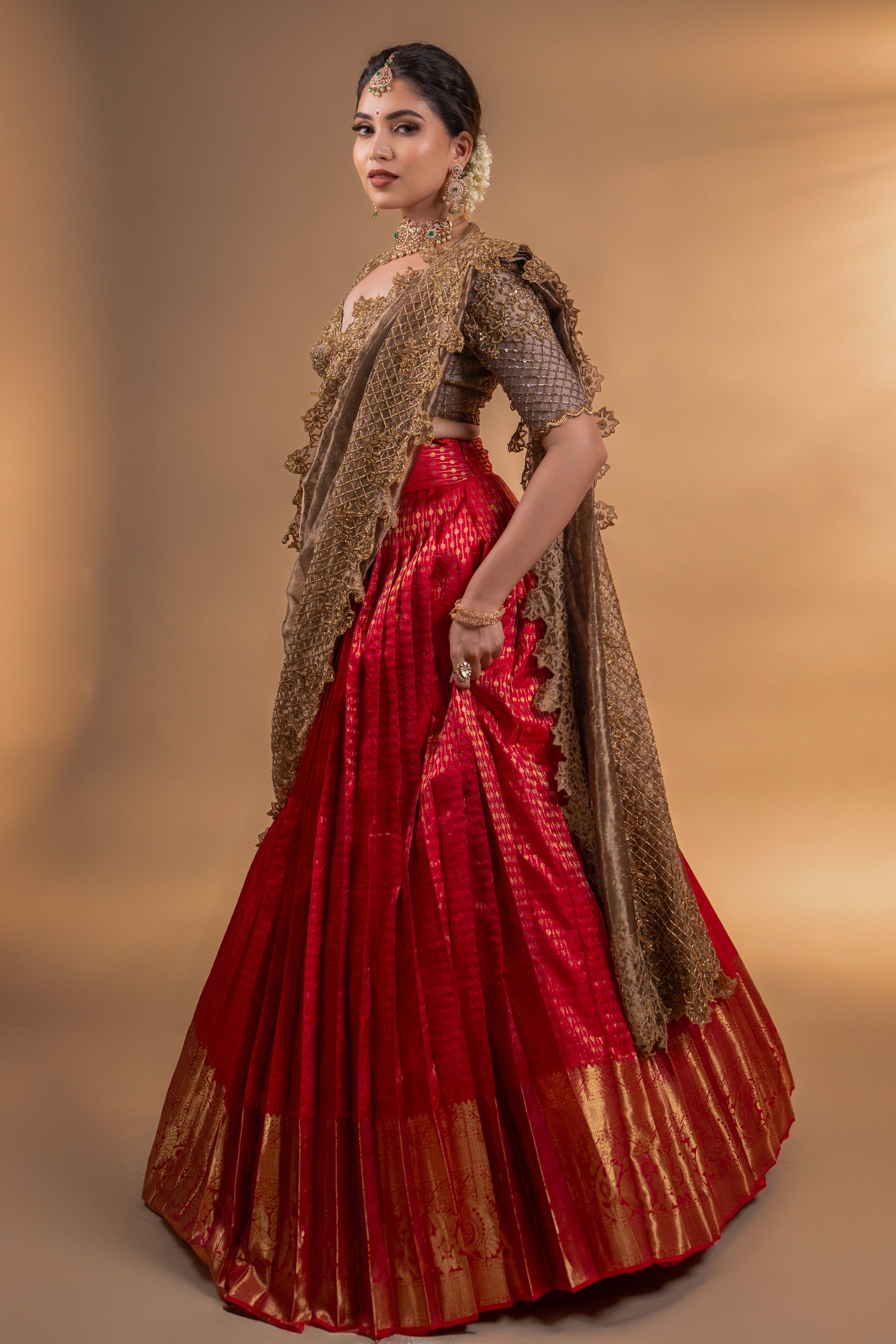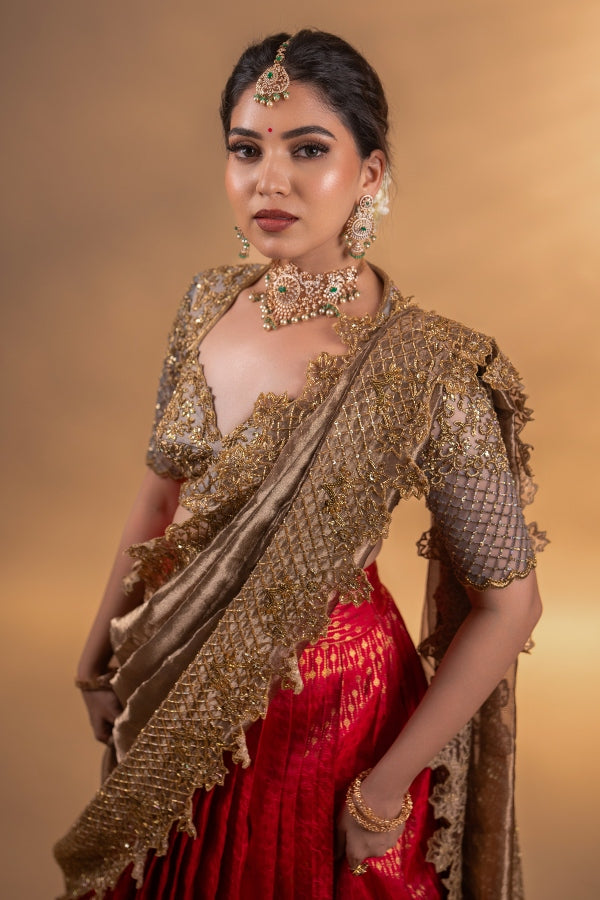 Regal and traditional yet contemporary half saree set in pure Kanjeevaram silk with a stunning designer blouse paired with beautifully handcrafted dupatta, a perfect designer bridal wear.