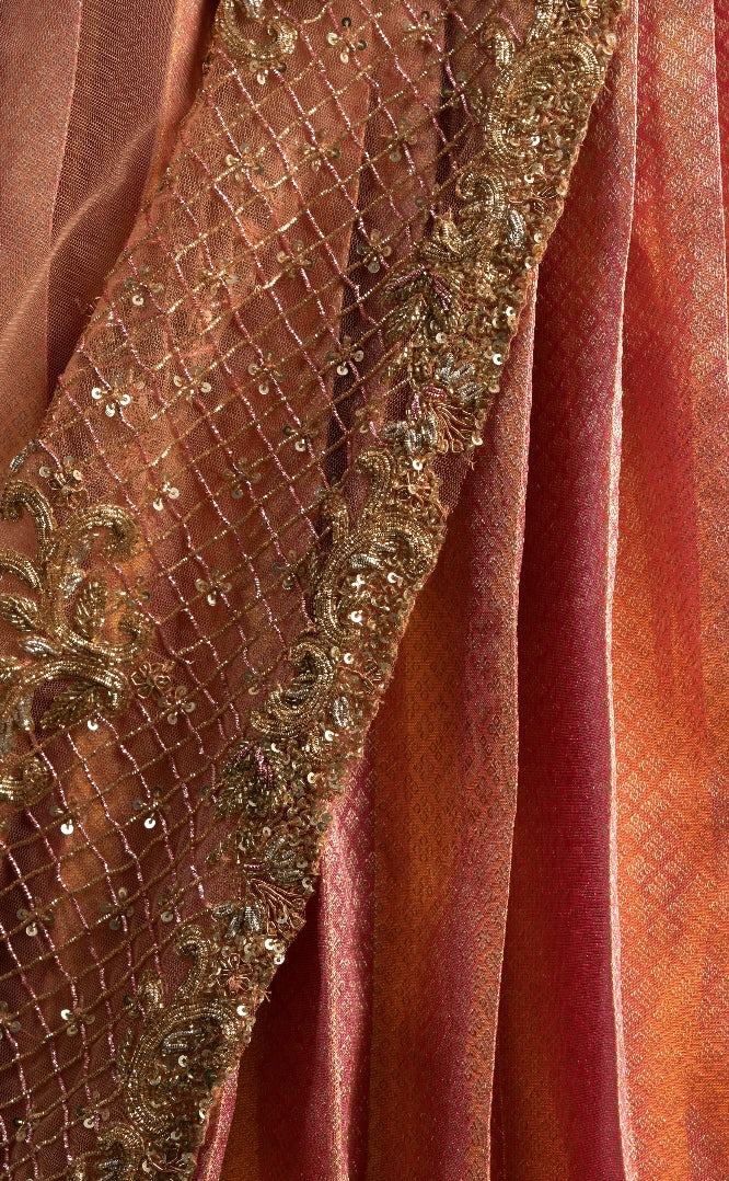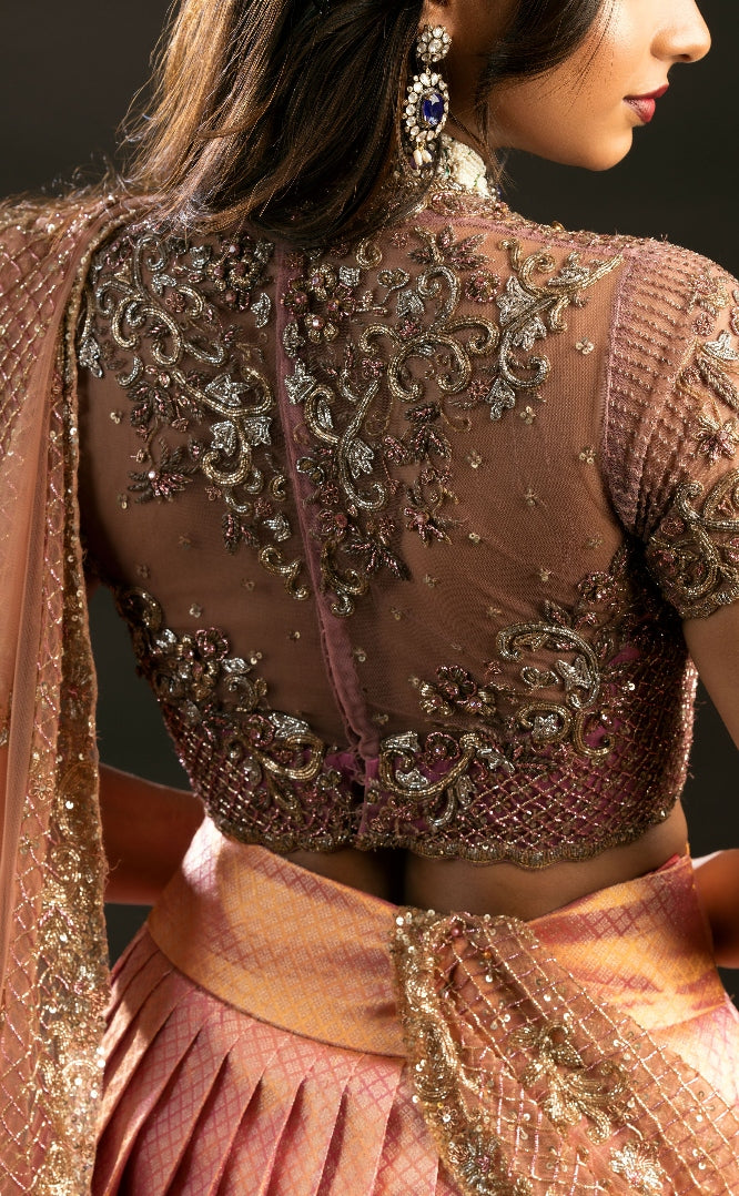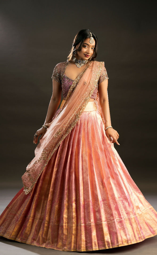 A stunning bridal kanjeevaram half saree in elegant peach and mauve tones. The blouse features intricate full zardosi embroidery with a stylish combination of silk on front and tulle on the sleeves and back. The set is paired with a beatifully crafted tulle dupatta embellished with delicate hand-embroidered zardosi, making it a perfect choice for brides seeking a regal and timeless look.
