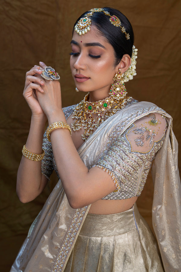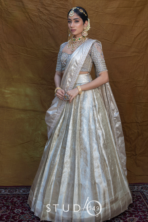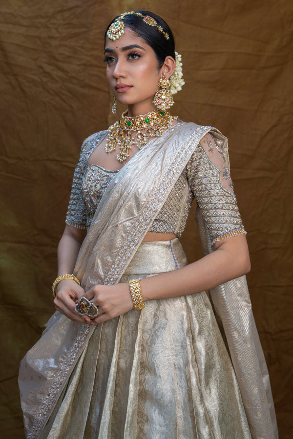 A fine blend of tradition in silhouette and fabric, the pleated skirt is paired with a monochrome tissue raw silk hand embroidered blouse and dupatta that elevate the look of this beautiful ensemble.