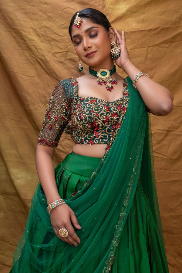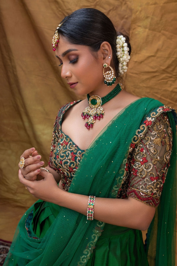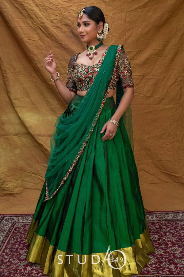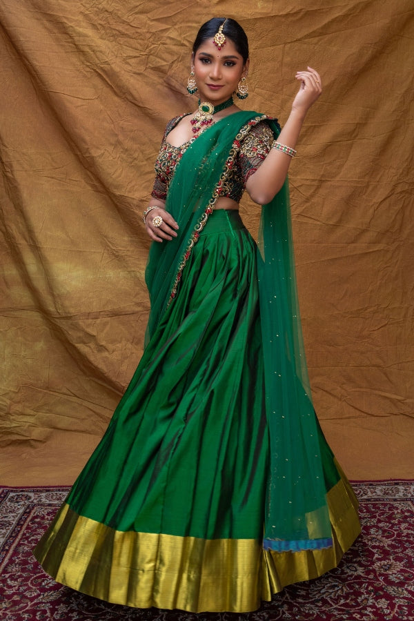 An ideal bridal attire for a south Indian bride, this designer silk half saree set showcases rich Kanjeevaram silk in shades of green, offering a perfect solution for your bridal trousseau.