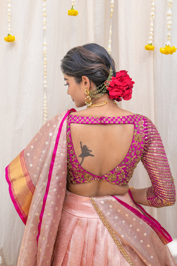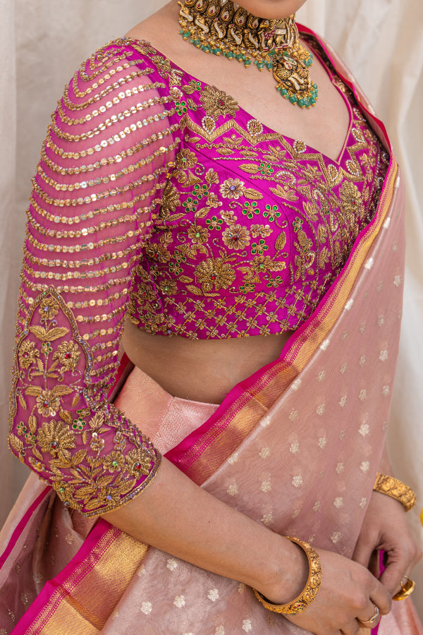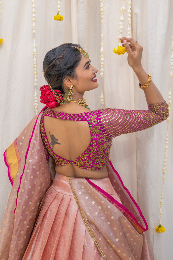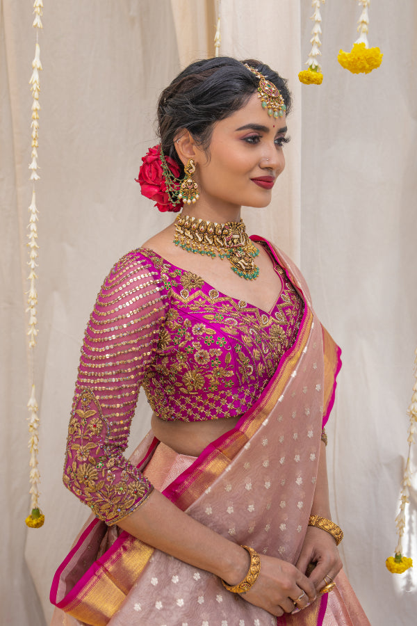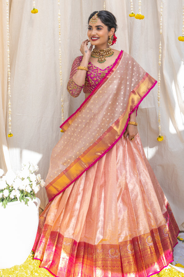 Adorned with traditional zari work, the pleated skirt in Pure Kanjeevaram silk tissue is elegantly paired with a hand-embroidered blouse in silk, and the ensemble is completed with a tissue dupatta with Kanjeevaram borders.