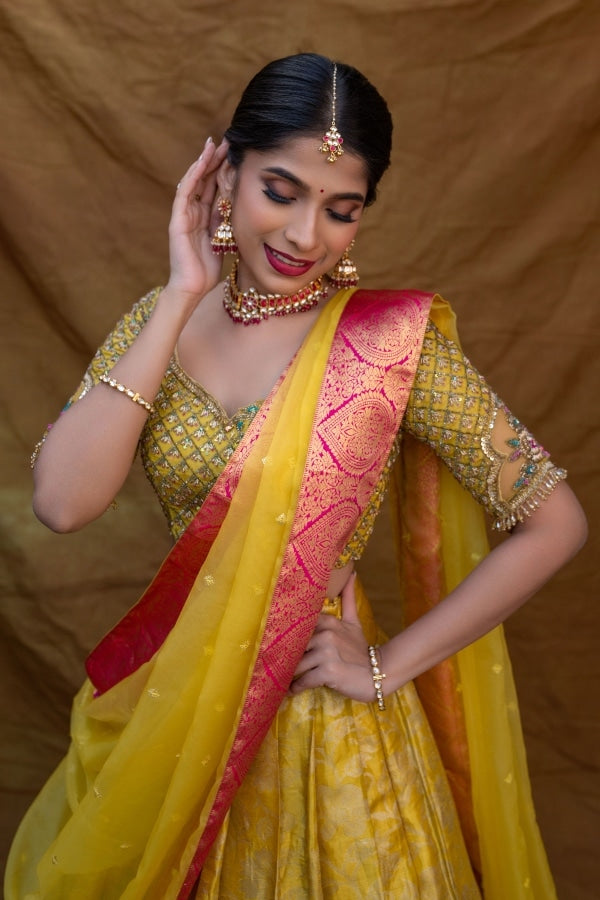 A classic Studio149 bridal wear outfit in yellow, this designer kanjeevaram half saree has a hand embroidered designer blouse and dupatta