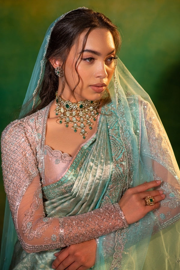 Paired with this ethereal bridal Kancheevaram tissue saree is a baby pink hand embroidered blouse along with a veil in the softest blue tulle creating an aura of mystique and allure.