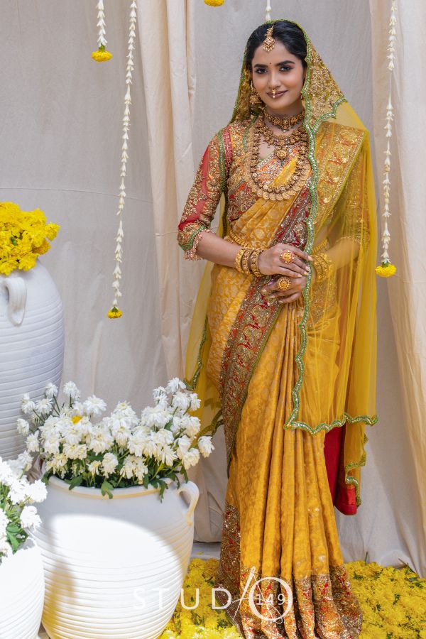 Ethereal combination of pure gold tissue kancheepuram saree with intricate hand embroidered border paired with a gold blouse in silk and tulle, A classic Studio149 Bridal Muhurtham saree.