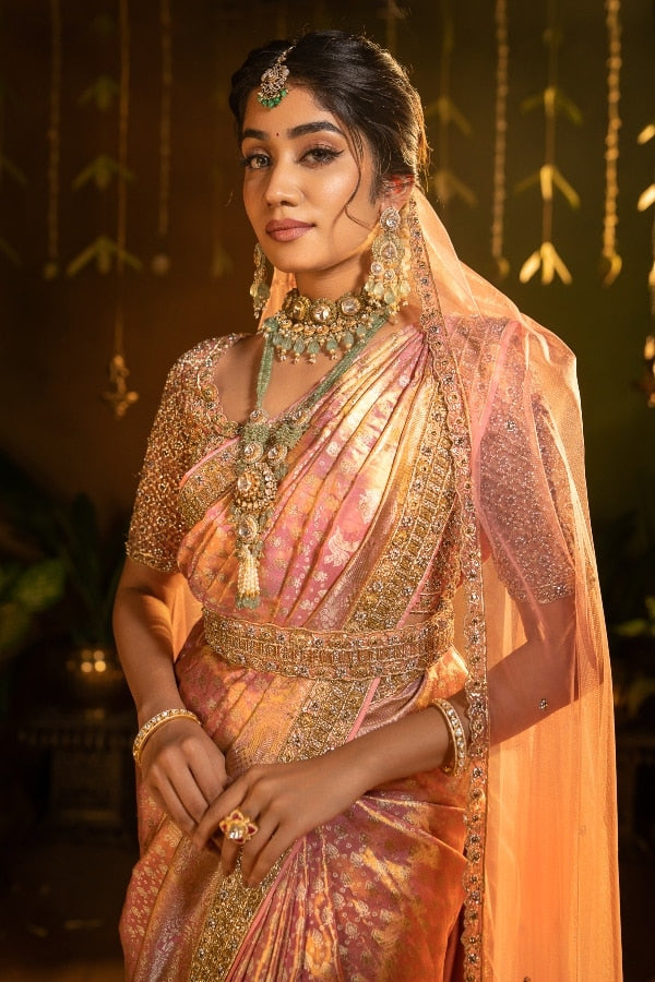 In the softest shade of peach, the delicate folds whisper tales of grace, accompanied by a crystal hand embroidered blouse and a matching waist belt and a hand embroidered veil completing a vison of sheer elegance.