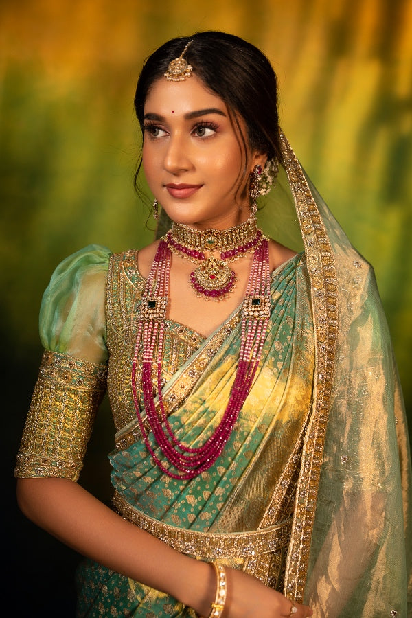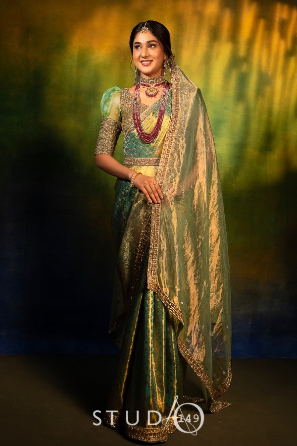 Heritage is adorned in the timeless appeal of this bridal Kancheevaram Silk tissue saree bedecked with signature Studio149 craftsmanship in a beautiful shade of teal reflecting stories of tradition.