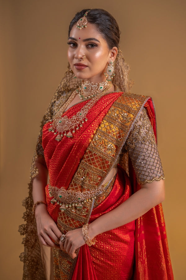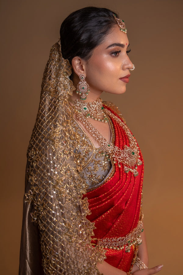 Red Kanjeevaram saree adorned with hand-embroidered gold border, paired with a meticulously hand-embroidered grey tulle blouse, excluding ethereal charm. The look is completed with a hand-embroidered grey veil in tissue.