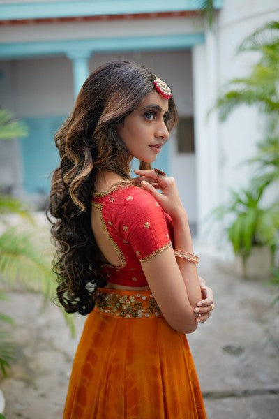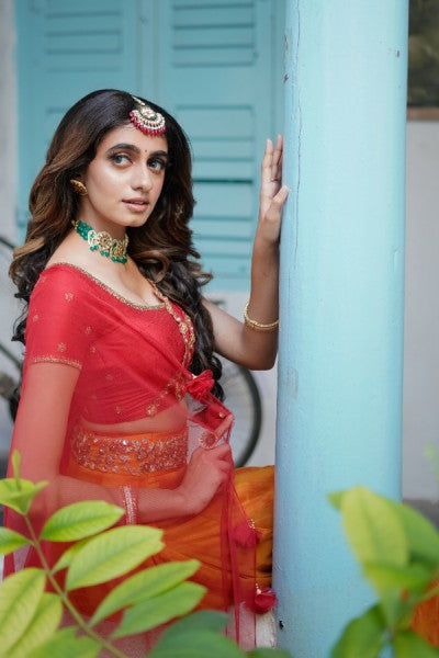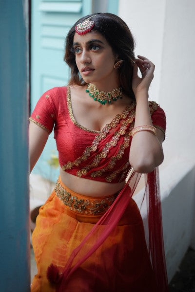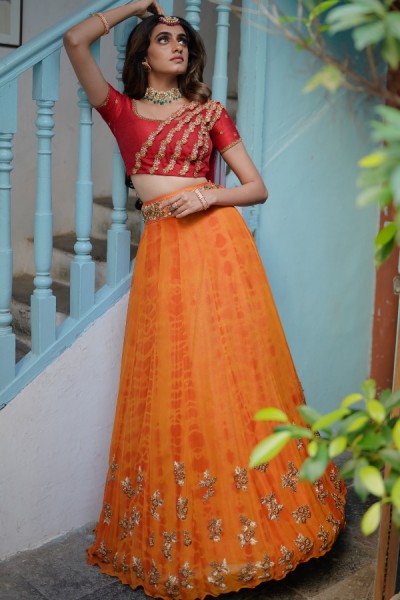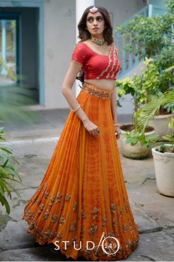 A strikingly elegant designer tie and dye skirt in shimmer georgette with a draped crop top, a Studio149’s perfect sangeet outfit for brides.