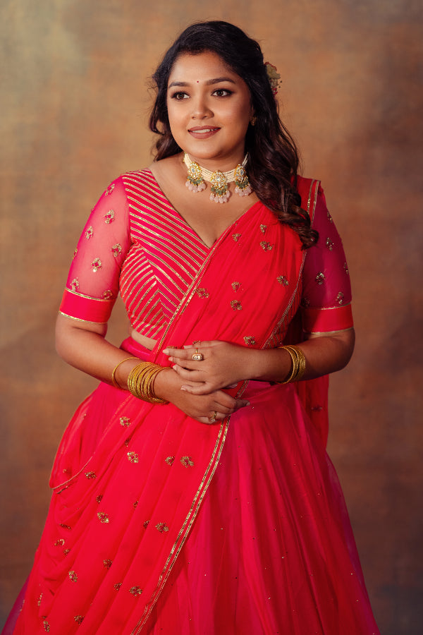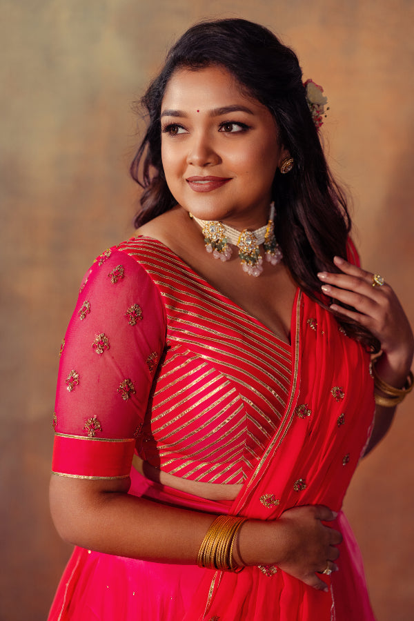 A strikingly elegant designer Contemporary tulle Wedding Lehenga in shades of pink suitable for brides.