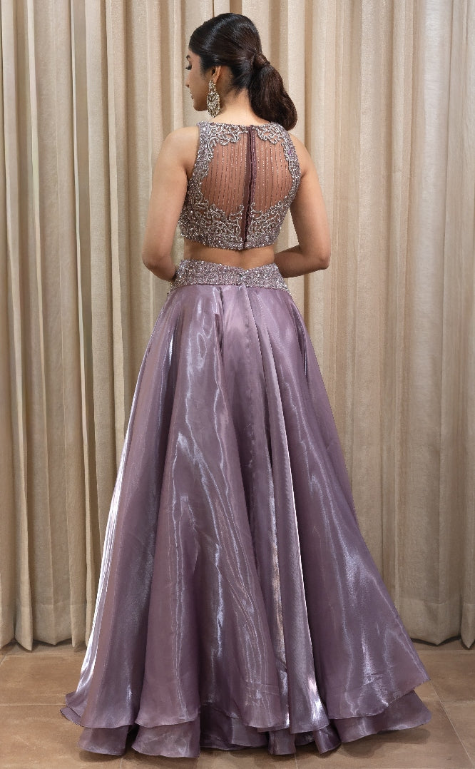 A graceful lilac ensemble featuring a hand-embroidered crop top paired with a voluminous tissue organza skirt. The soft lilac hue exudes feminine charm, while the intricate embroidery adds a touch of artistry and elegance. Perfect for festive occasions or intimate celebrations, this look blends ethereal beauty with modern sophistication.