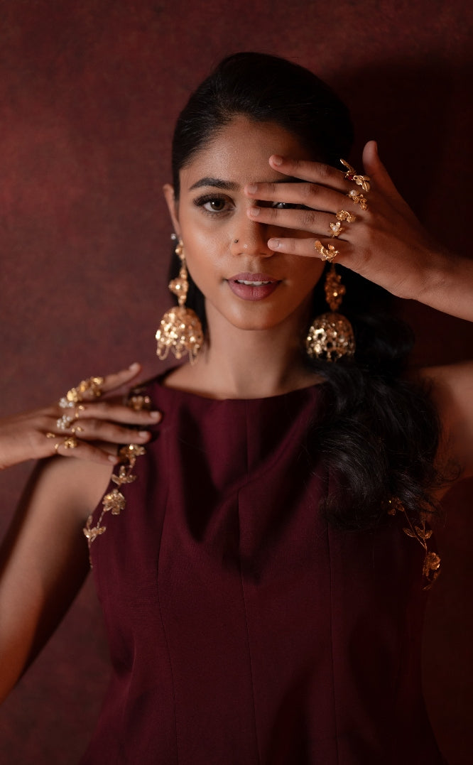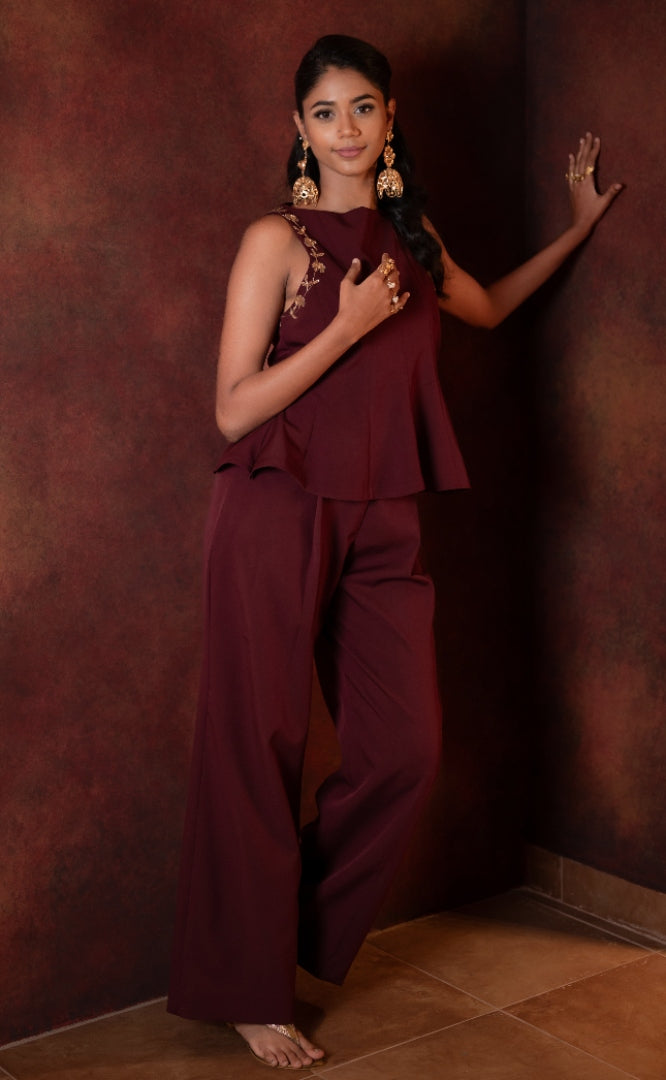 Crafted in rich wine, this ensemble pairs a sleeveless peplum top with tailored straight pants. Accented with statement jewels, it flows seamlessly from day to evening with understated grace.