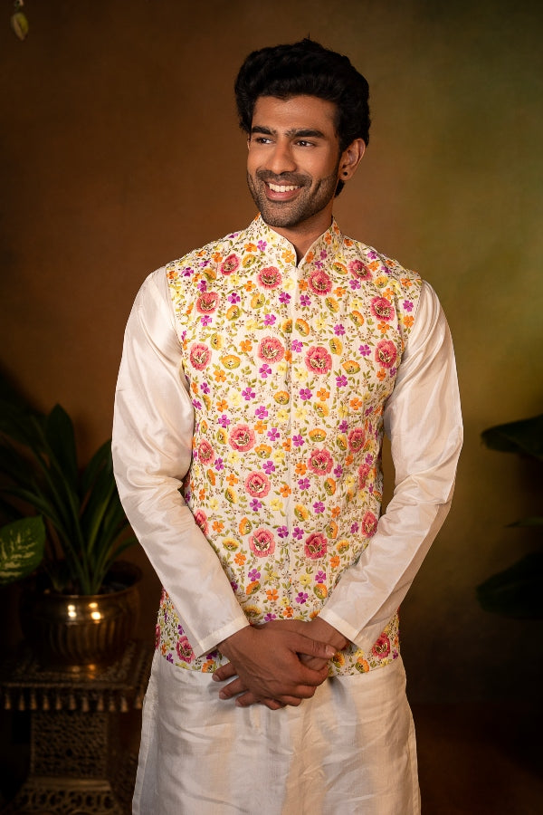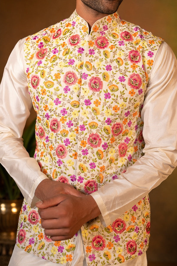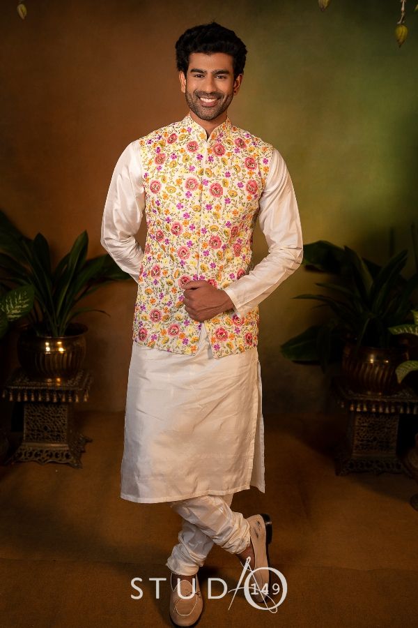 A floral embellished bandi jacket paired with an off-white kurta and trousers, the ensemble is stunning highlighting the groom’s confident and composed demeanor.