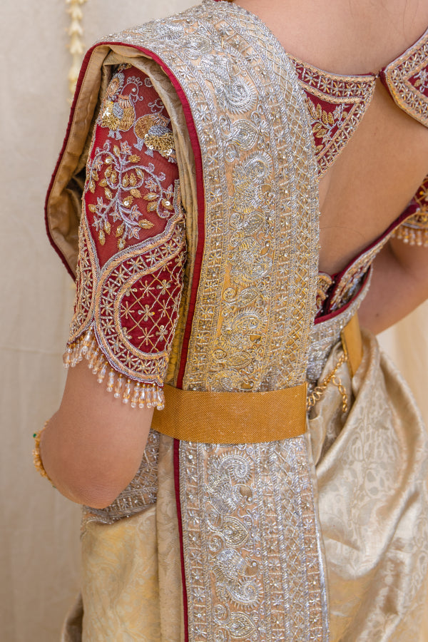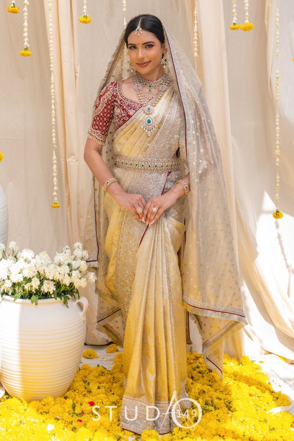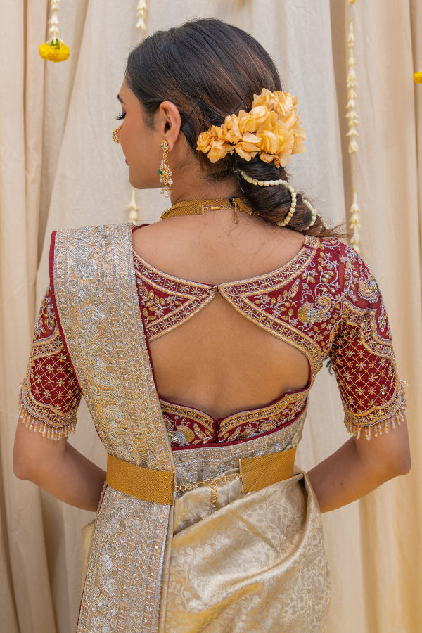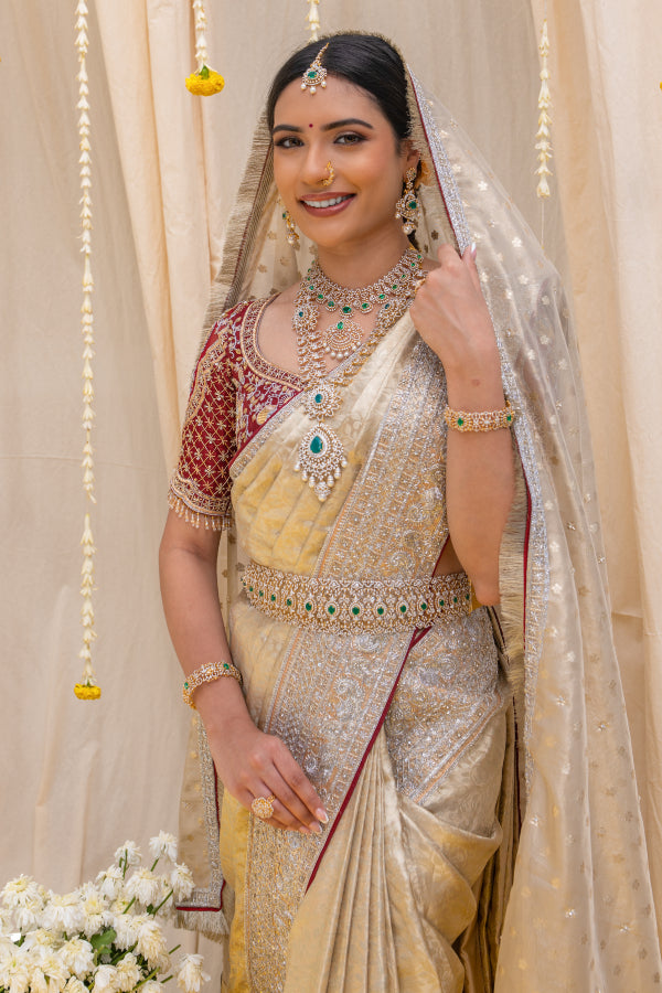 Bridal Kanjeevaram tissue sari in an ethereal silver. Paired with a timeless maroon blouse, finished with a tissue veil that accents as beautiful as the bride herself.