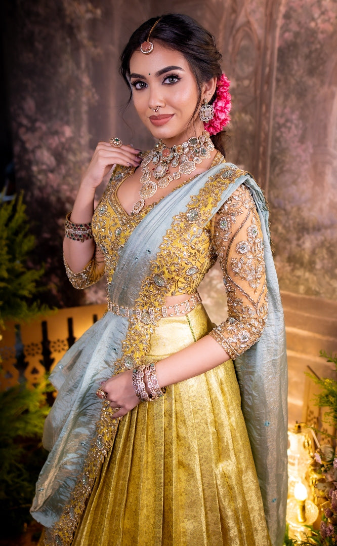 Completing the ensemble is a blue tissue dupatta, highlighted with yellow pure silk floral cutwork embroidery that beautifully echoes the blouse accents. Ideal for engagements, sangeet celebrations, or reception soirées, this half saree set is crafted for the modern bride who values artistry, romance, and understated luxury.