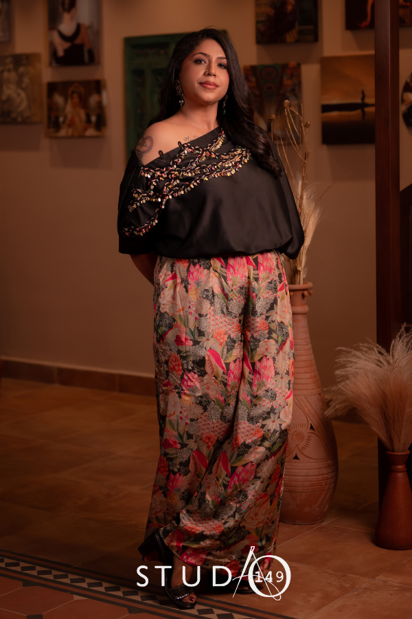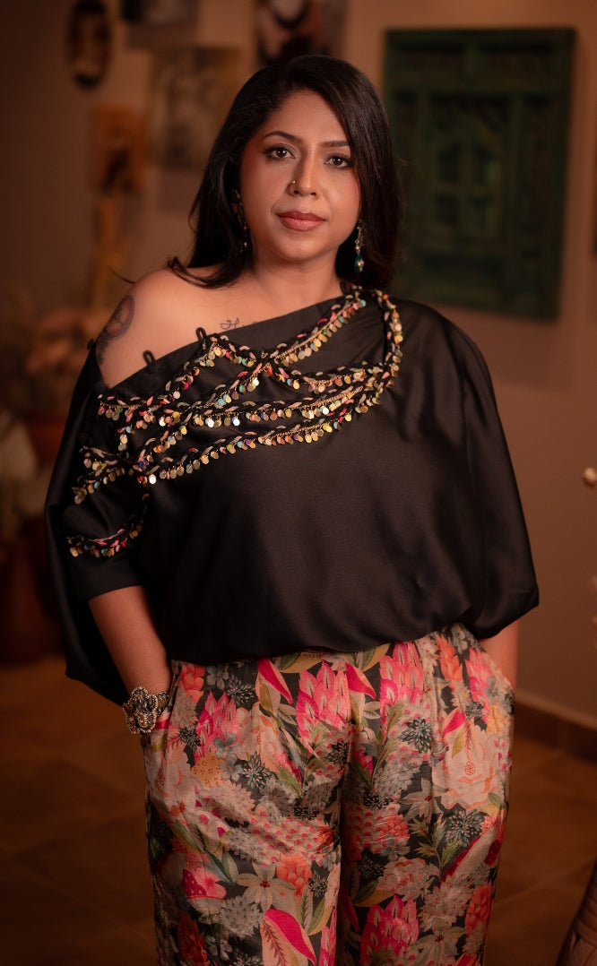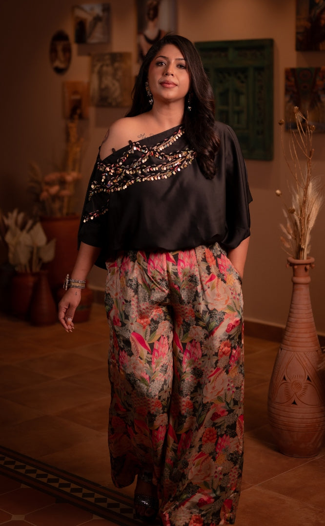 A statement black off-shoulder crop top adorned with delicate embellishments, paired with printed crepe pants. The ensemble blends modern glamour with effortless sophistication, perfect for contemporary occasions.