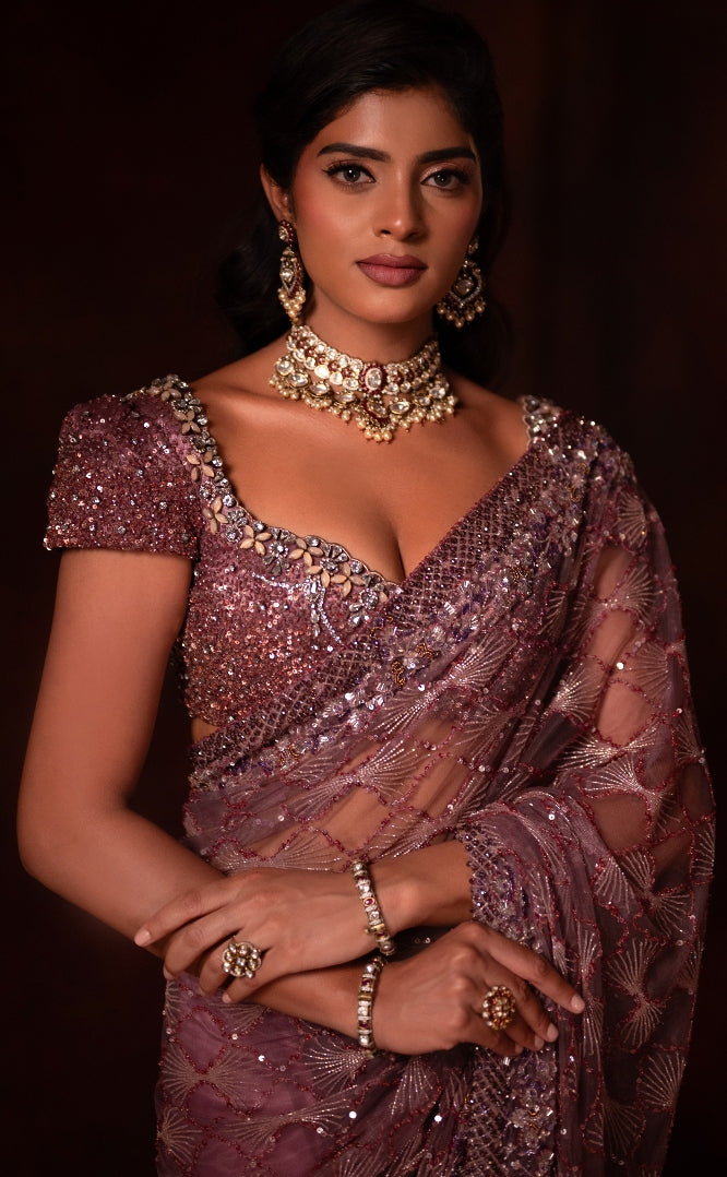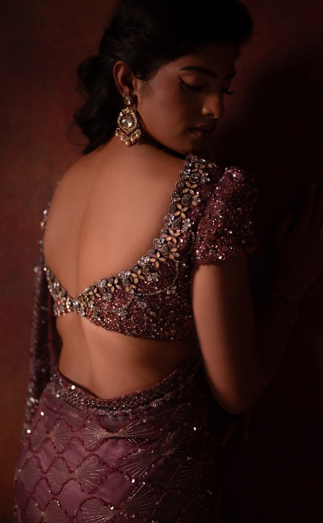 A contemporary mauve tulle saree intricately embroidered with cutdana, beads, and crystals in elegant jali patterns. Saree is beautifully highlights the detailed craftsmanship, Paired with a fully hand-embroidered blouse adorned with crystal stone work, this ensemble exudes modern sophistication.