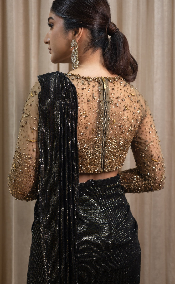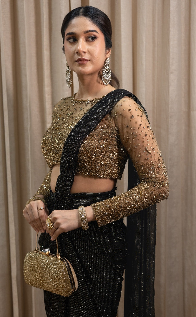 This elegant black drape saree in georgette showcases fluid movement and refined style. It is paired with a statement full-sleeve blouse adorned with delicate hand embroidery, adding a touch of glamour and grace.
