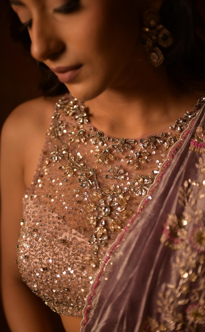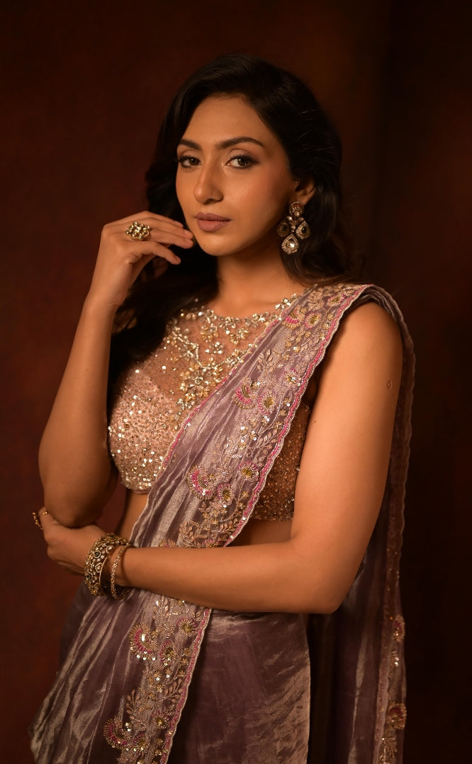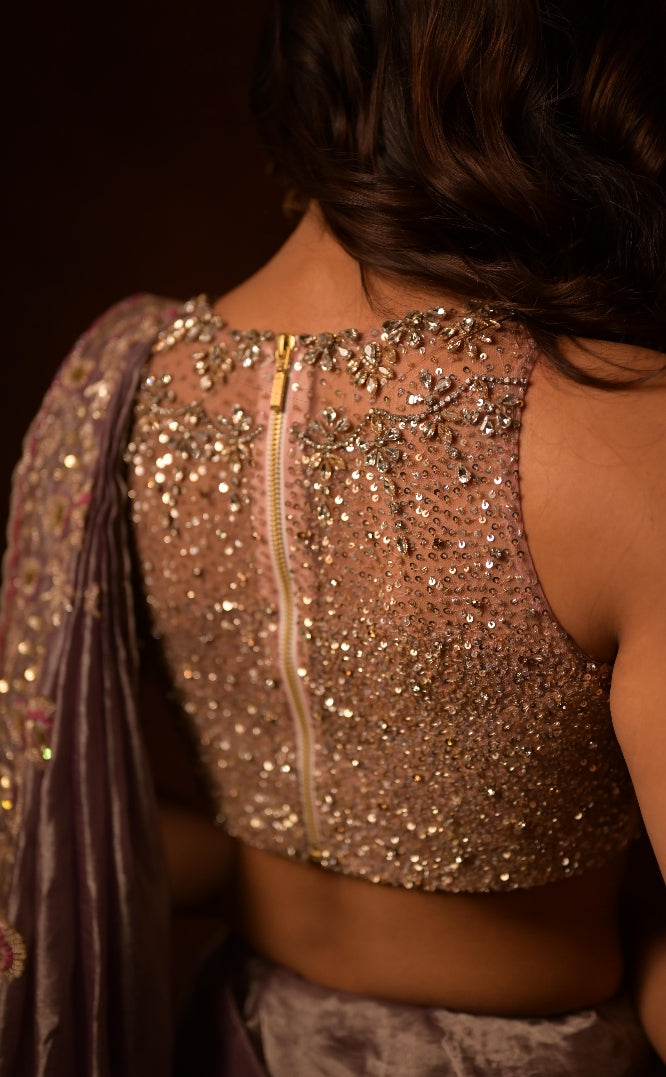 An exquisite lilac saree paired with a sleeveless hand-embroidered blouse, intricately adorned with shimmering sequins and delicate beadwork. The luxurious texture and graceful drape timeless elegance.
