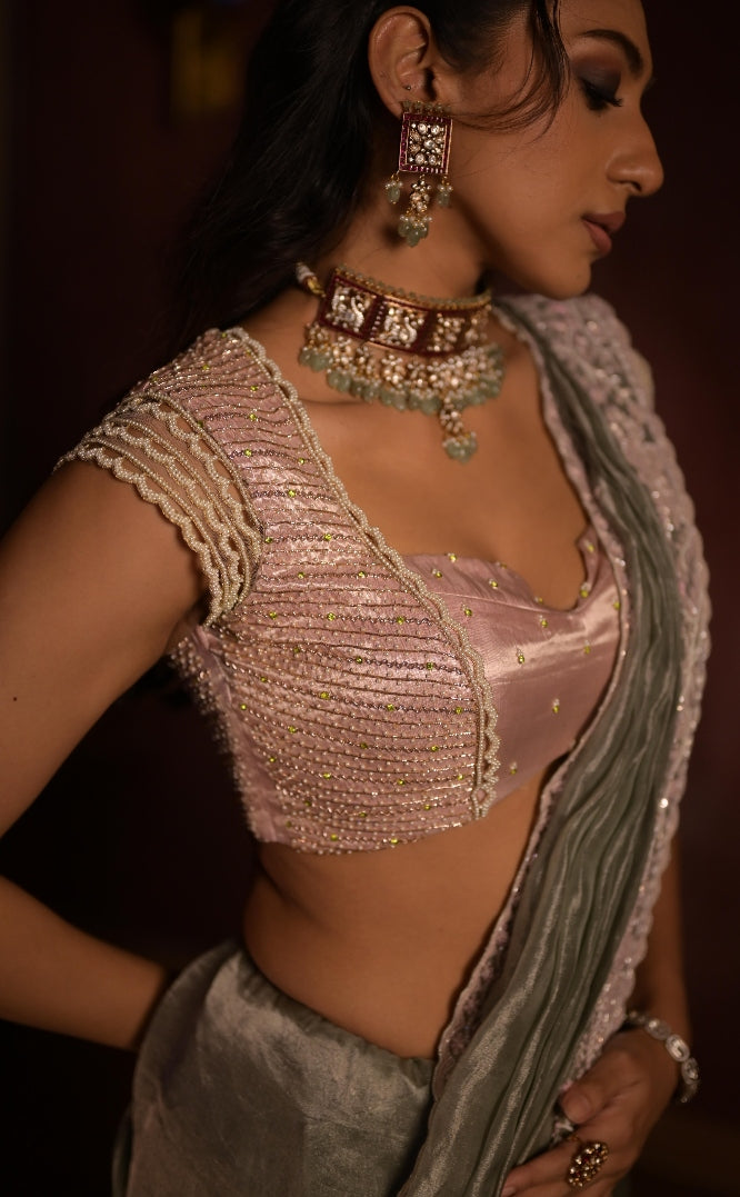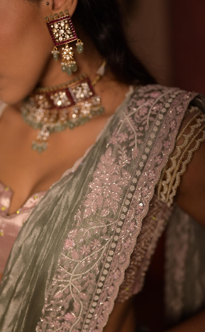 A serene mint green crafted in a lustrous fabric, adorned with exquisite hand embroidery along the borders. Paired with a delicately embellished blouse in pastel pink this ensemble radiates understand luxury and timeless charm.