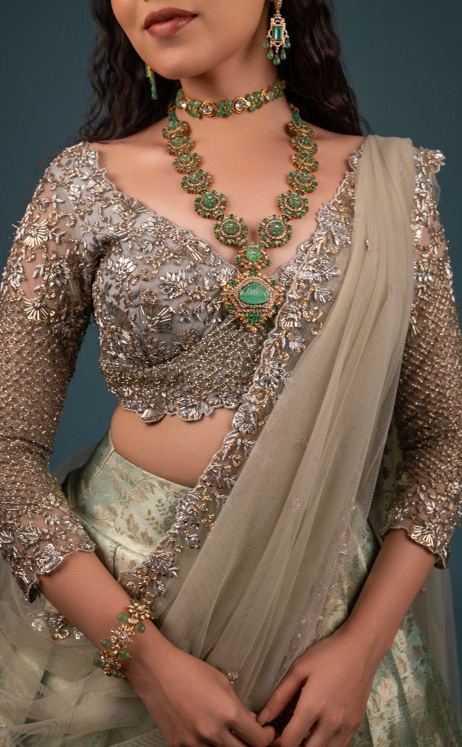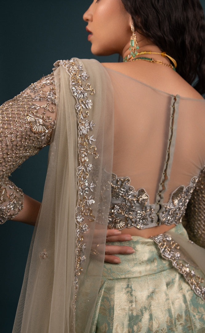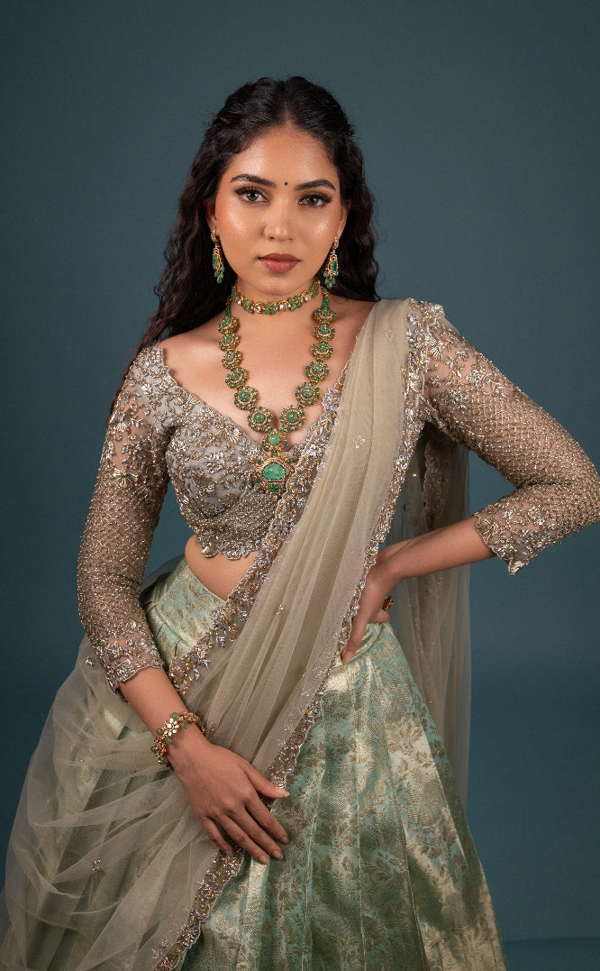 This half-sari is a stunning symphony of blue and silver, blending soft pastels with an air of refined elegance. The tulle dupatta with hand-embroidered flows gracefully, complementing the blouse, which is intricately embroidered with a geometric lattice of shimmering stones and zardozi. The skirt, crafted from pure Kanjeevaram tissue, features an exquisite all-over weave, highlighted by a striking blue border.