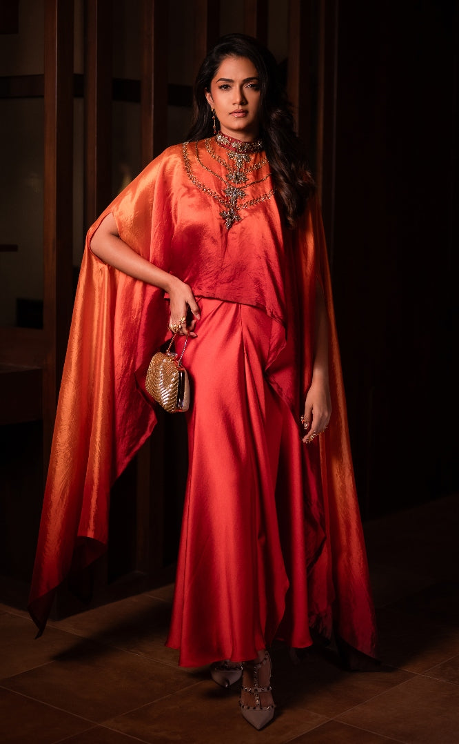 A bold and elegant statement, this set highlights a satin draped skirt paired with blouse, elevated by a sheer silk organza cape adorned with delicate embroidery. The rich red-orange hue and fine detailing come together to exude sophistication and festive glamour.