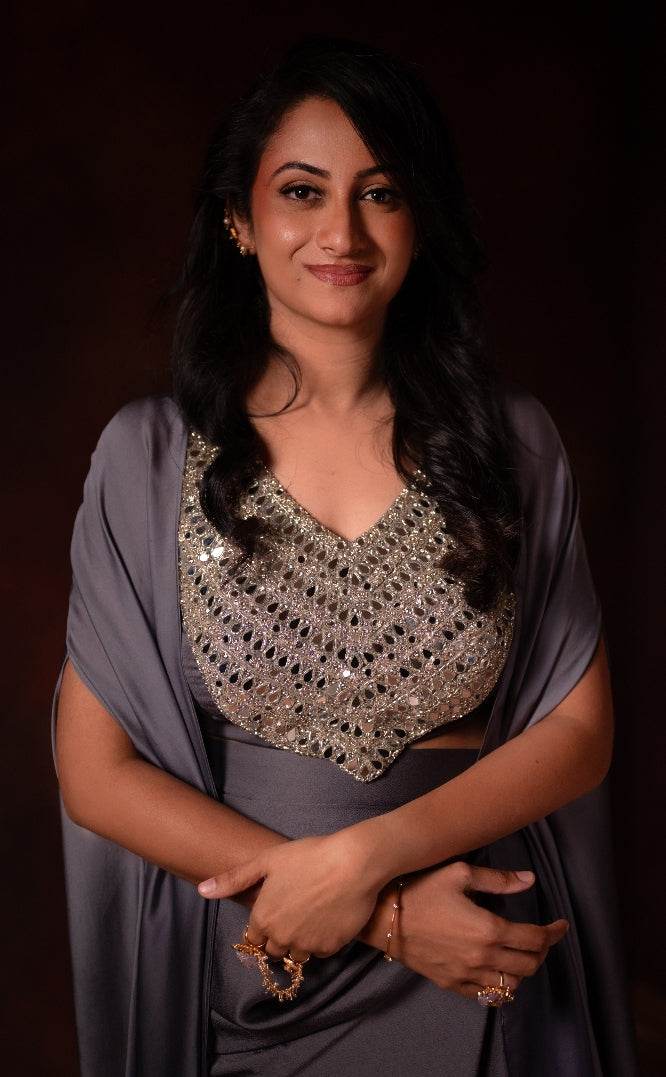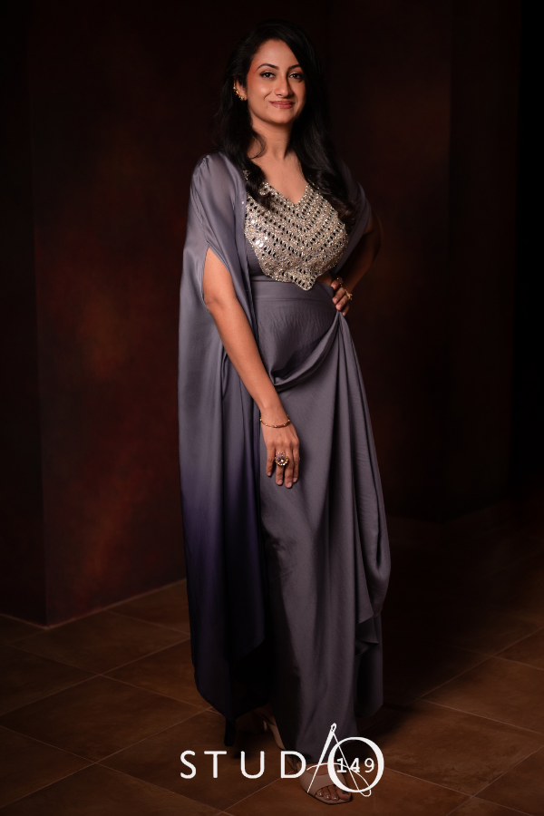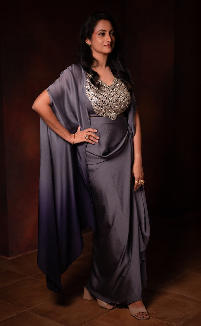 A desinger satin drape skirt in elegant grey, paired with a satin blouse highlighted with mirror embellishments. The ensemble is completed with a pure silk georgette cape, adding a touch of fluid grace and contemporary charm.
