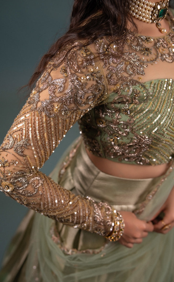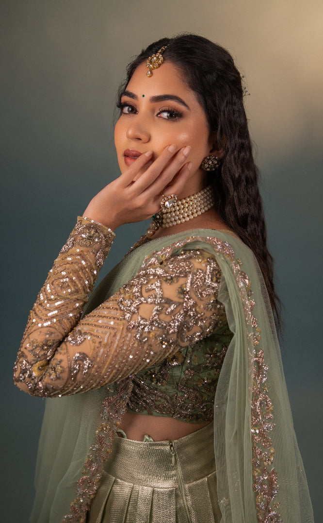 Dive into a world of ethereal beauty with this hand embroidered blouse in delicate mint green complimenting the silver-green Kanjeevaram skirt. Completing the look is an exquisite green hand embroidered dupatta in tulle