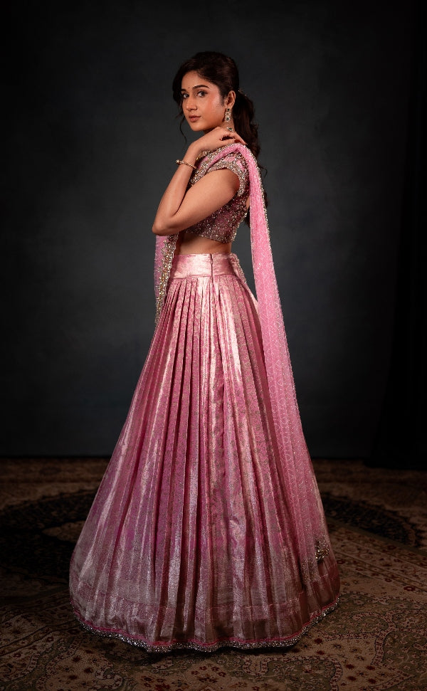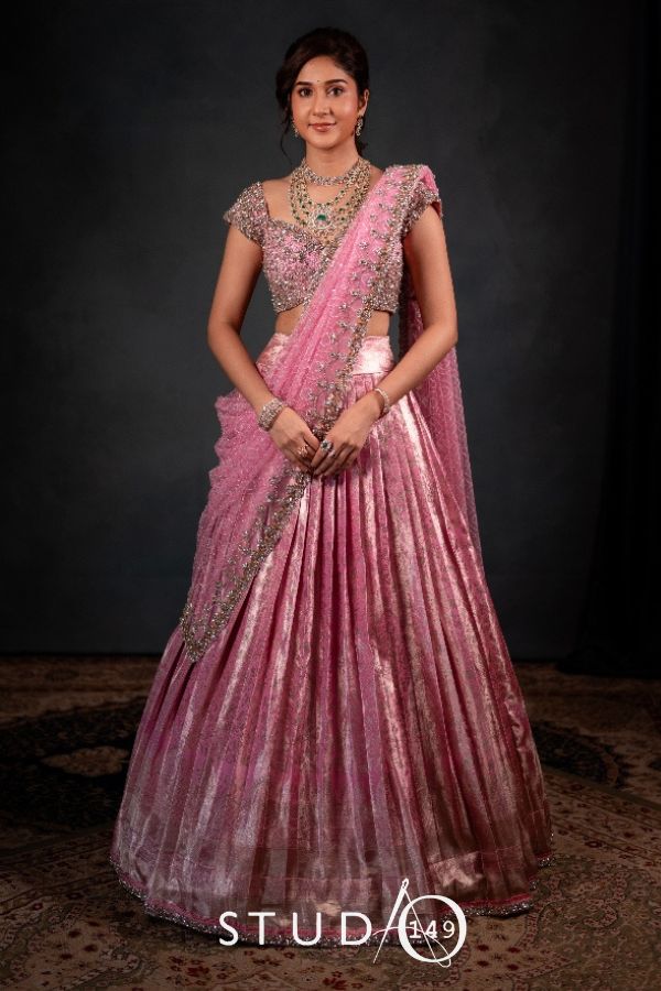 Step into timeless elegance with Studio 149’s pastel pink Kanjivaram half saree, a luxurious blend of traditional South Indian craftsmanship and modern bridal allure. Designed and handcrafted in Chennai, this exquisite ensemble celebrates the artistry of Indian weaves and the finesse of hand embroidery.