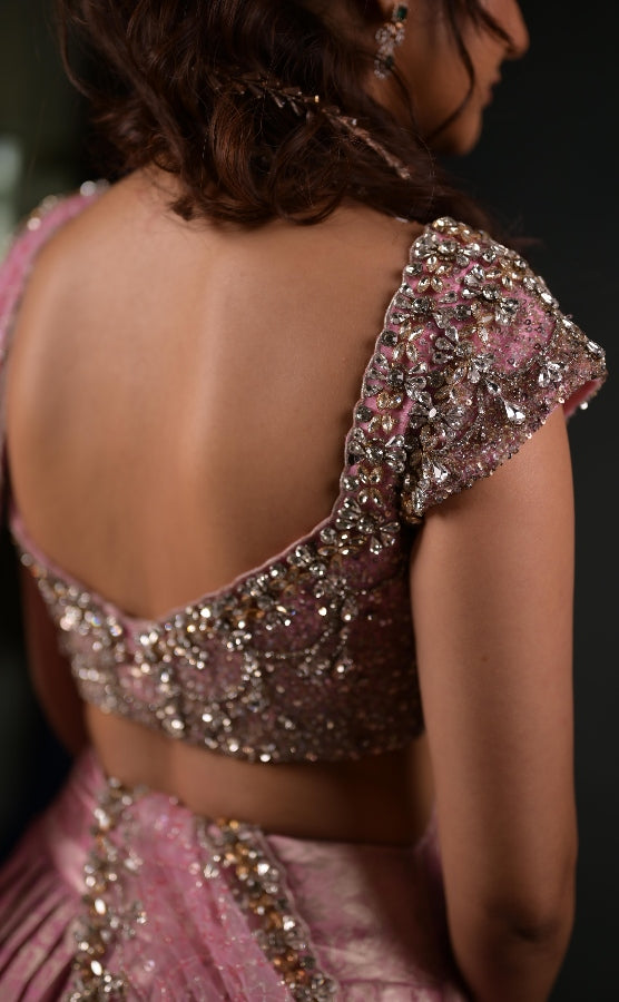 The blouse and dupatta are crafted from a soft tulle base, intricately hand embroidered with a medley of sequins, fine threadwork, and cut-glass bugle beads. Adding a touch of opulence, the design is accentuated with marquise- cut crystal stones in shades of white and champagne, reflecting light with an ethereal iridescence. The wide neckline of the blouse adds a modern edge, making it perfect for pairing with diamond or contemporary jewellery.