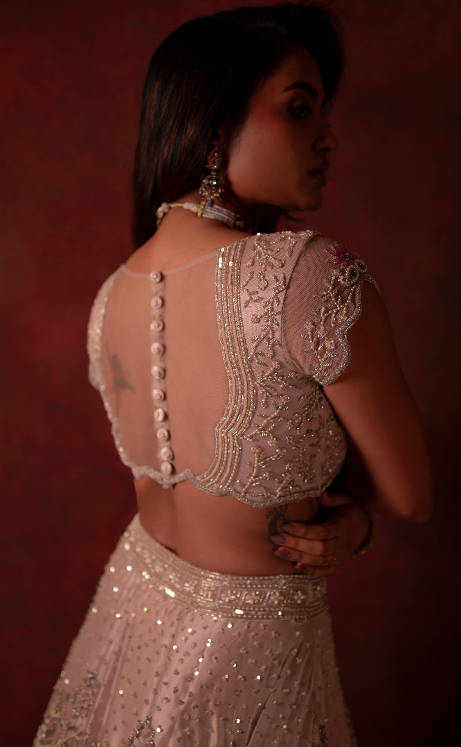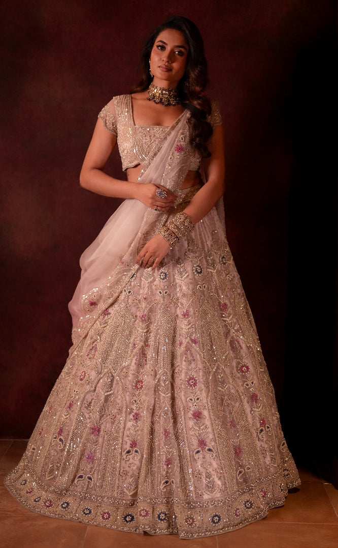 This ensemble features a tulle lehenga in a soft onion pink hue, exquisitely hand-embroidered with pearls, sequins, and delicate thread work that shimmer with understated luxury. The intricate craftsmanship across the panels creates a graceful play of light, perfectly capturing the charm of a modern-day bride. It is paired with an ombre-shaded silk organza dupatta, delicately bordered with hand embroidery, adding a touch of fluid sophistication to the ensemble. The blouse mirrors the lehenga’s intricate pearl and sequin detailing, completing the look with refined balance and glamour.