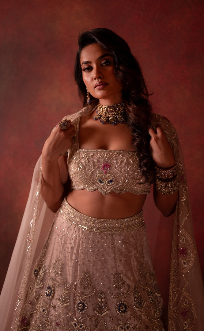 Lehenga: Delicate tulle, features intricate hand embroidery