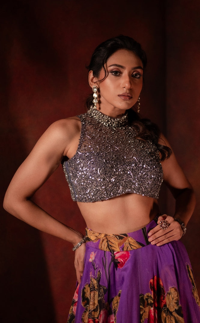 This enchanting purple ensemble by Studio 149 brings together fluid elegance and artisanal craftsmanship. The full-flare chinon skirt showcases vibrant floral prints that create effortless movement and a romantic, statement-making presence. Paired with it is a stunning hand-embroidered tulle crop top with halter neckline blouse, intricately adorned with shimmering embellishments that highlight the neckline. The interplay of the soft, flowy skirt with the structured, embellished bodice creates a silhouette that is both modern and ethereal, embodying handcrafted luxury at its finest.