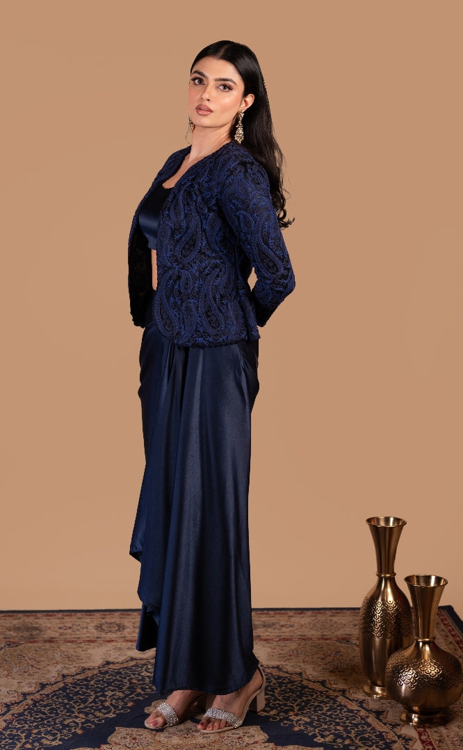 Wedding Cocktail Co-ord Set in Navy Blue with Satin Drape Skirt & Paisley Jacket by Studio149