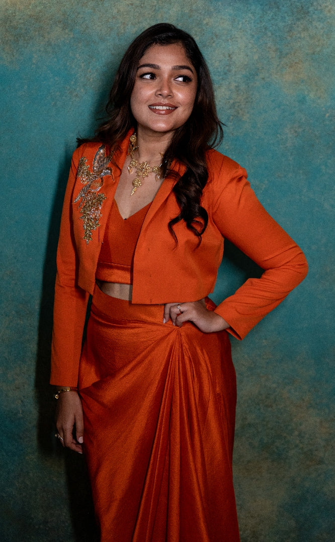 An elegant tangerine draped saree set crafted in nirvana satin. The ensemble features a modern cropped blouse paired with a structured jacket beautifully adorned with intricate hand embroidery on one shoulder, This look blends traditional grace with modern sophistication.