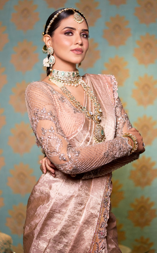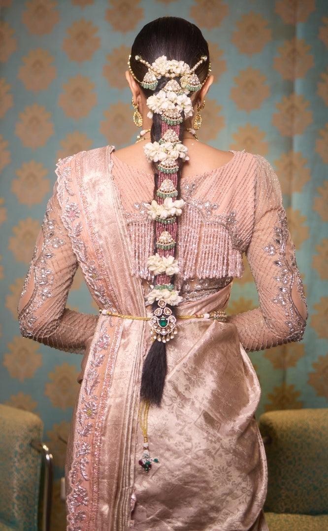 Experience elegance with this Silver and Peach Bridal Muhurtam Saree from Studio 149. The saree features an attached border adorned with intricate hand embroidery, showcasing exquisite zardosi and cutdana detailing. The peach raw silk blouse is richly embellished with full hand embroidery and delicate tulle sleeves.The back is finished with graceful crystal hangings, adding a subtle shimmer to the ensemble. Perfect for the modern bride and regal Muhurtham look.