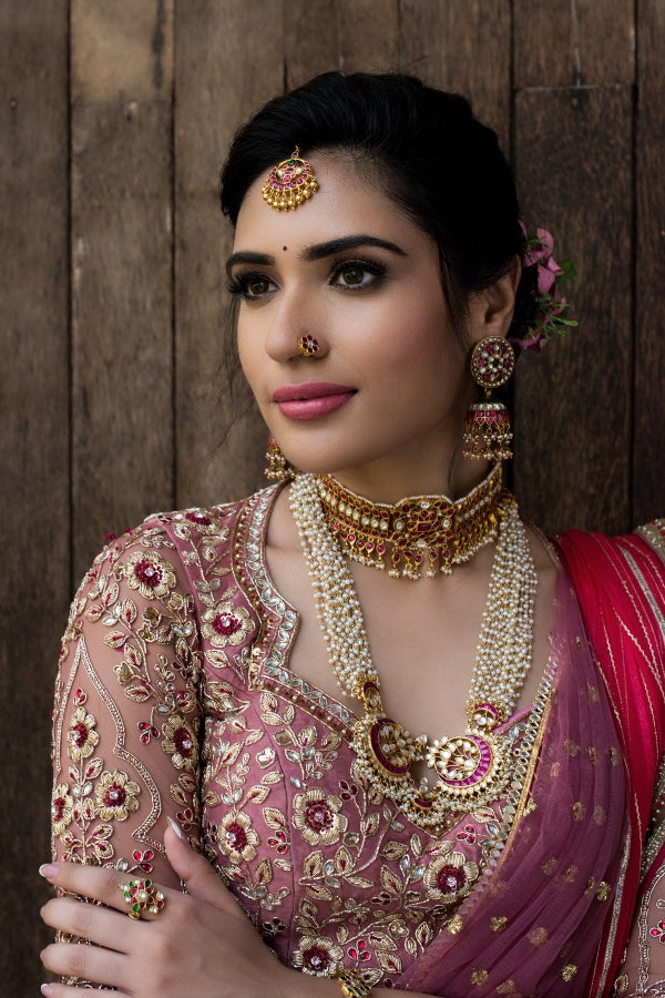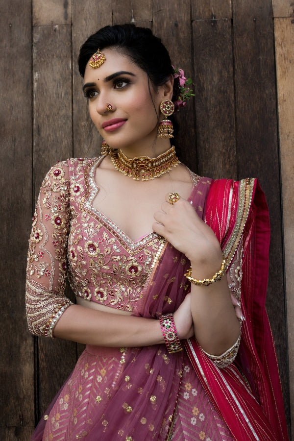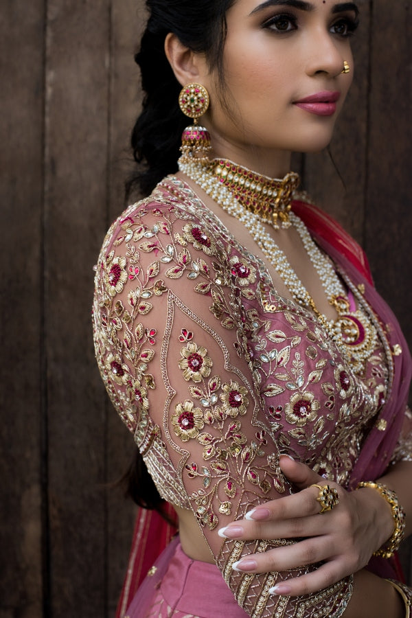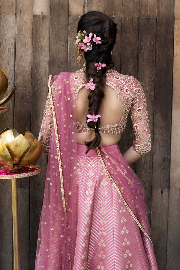 A pink Banares Silk lehenga set, adorned with beautiful floral motifs. Paired with a pink blouse with embroidery. Layering this outfit with a dual dupattah, keeping the whole look classic!