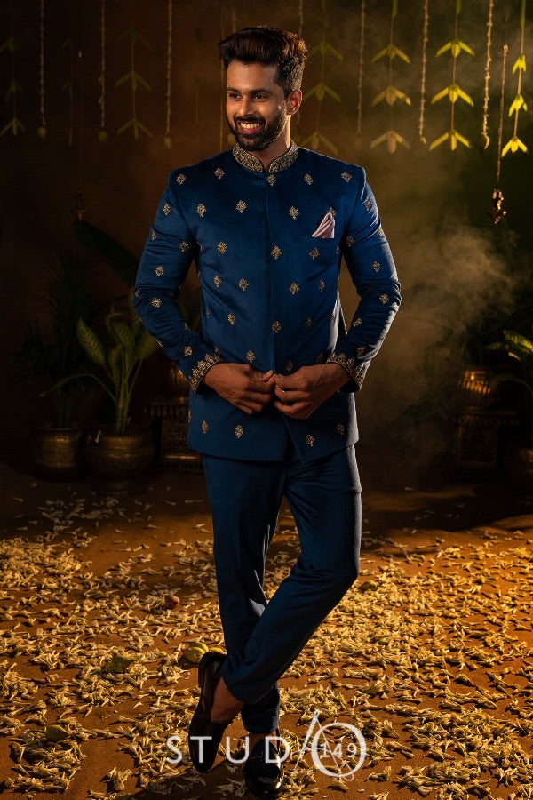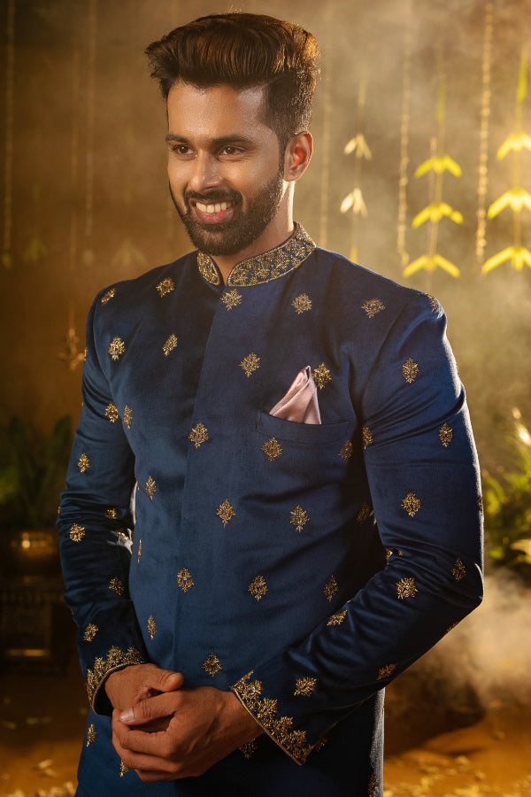 Elegance find its epitome in this men’s attire, where a hand embroidered blue velvet bandhgala takes center stage, gracefully paired with perfectly matching velvet trousers.