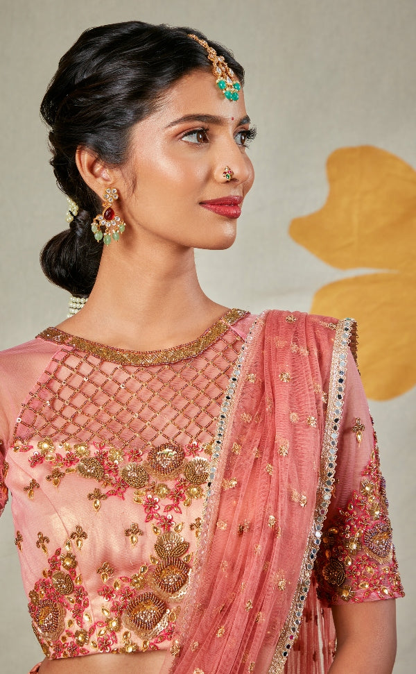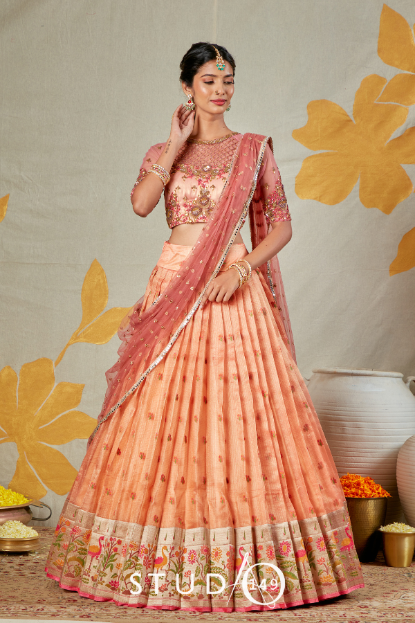 Studio 149's half saris crafted with lightweight kota tissue and delicate tulle fabric offer a breezy, ethereal elegance perfect for mordern brides. The airy layers create a graceful silhouette, blending tradition with contemporary lightness. Each piece feels effortlessly chic, adding a soft, romantic touch to a timeless attire.