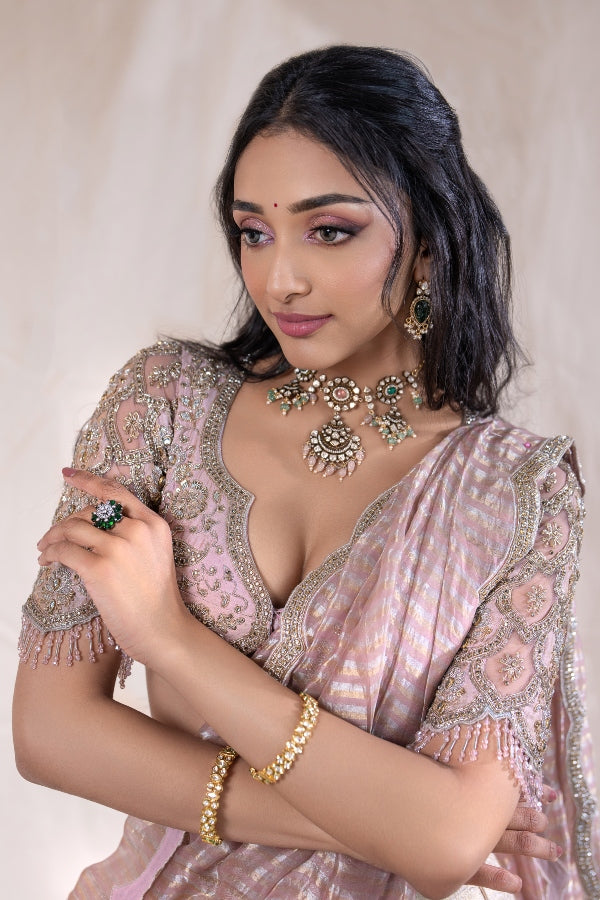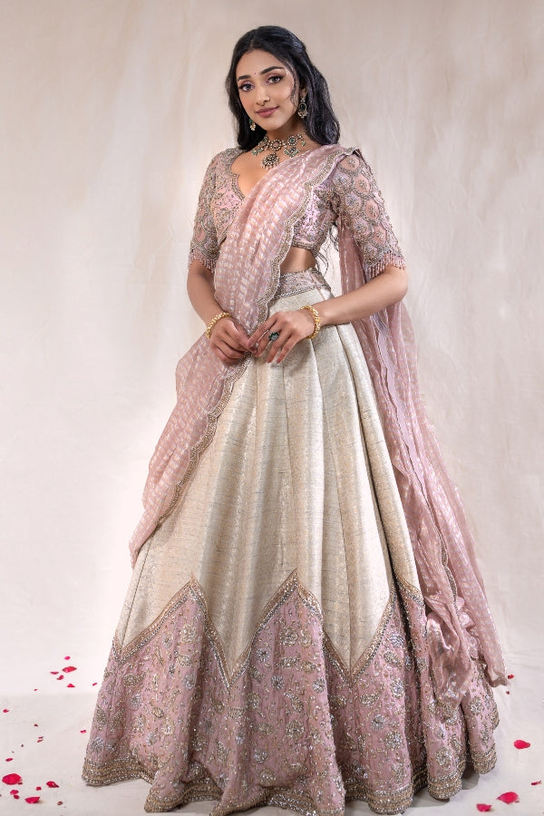 The signature Studio149 lilac blouse paired with a beautiful paneled lehenga in silver Banaras and lilac raw silk.