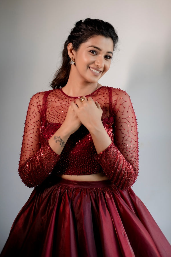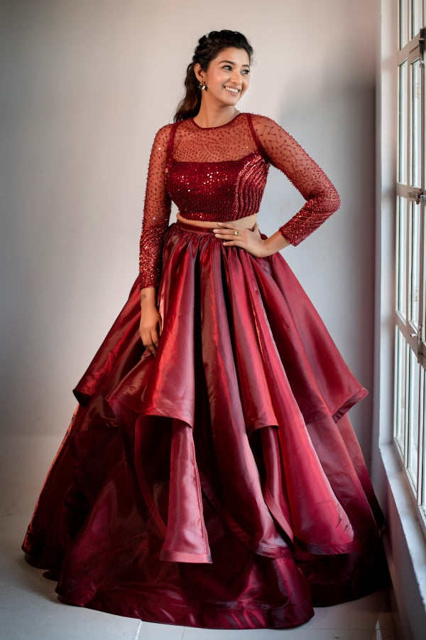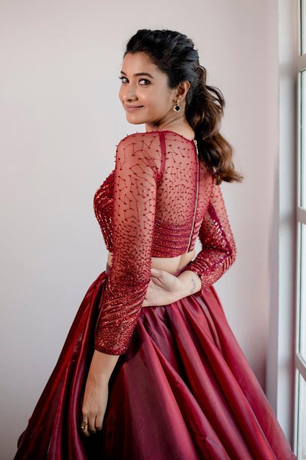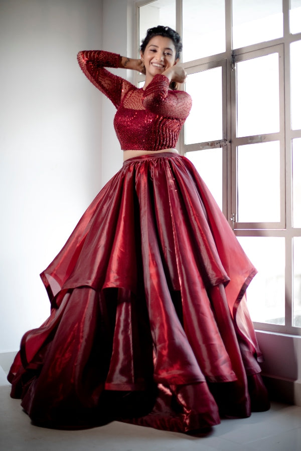 A beautiful Designer Reception Gown in shade of burgundy with a designer embellished blouse, Studio149 perfect Bridal Gown.